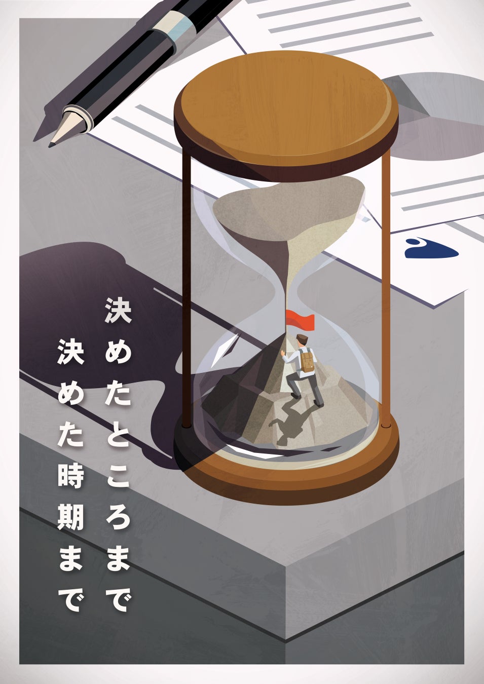 ポスター内には「時間」をイメージした砂時計と、その砂時計の中には「目標」という山と「その山を登る人」を描き、ビジュアルで「リケンテクノス ウェイ」をイメージできるような構成としました。