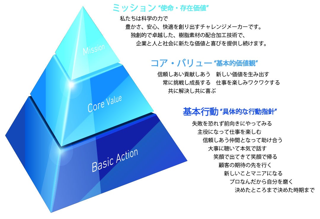 「リケンテクノス ウェイ」とは、創業60周年を迎える際に策定された当社グループの経営理念です。ミッション(使命・存在価値)、コア・バリュー(基本的価値観)、基本行動(具体的な行動指針)の3階層で構成されています。ミッションにある「チャレンジメーカー」という言葉は造語ですが、製造業という意味でのメーカーというほかに、挑戦して何かを創り出す人という意味もこめられています。