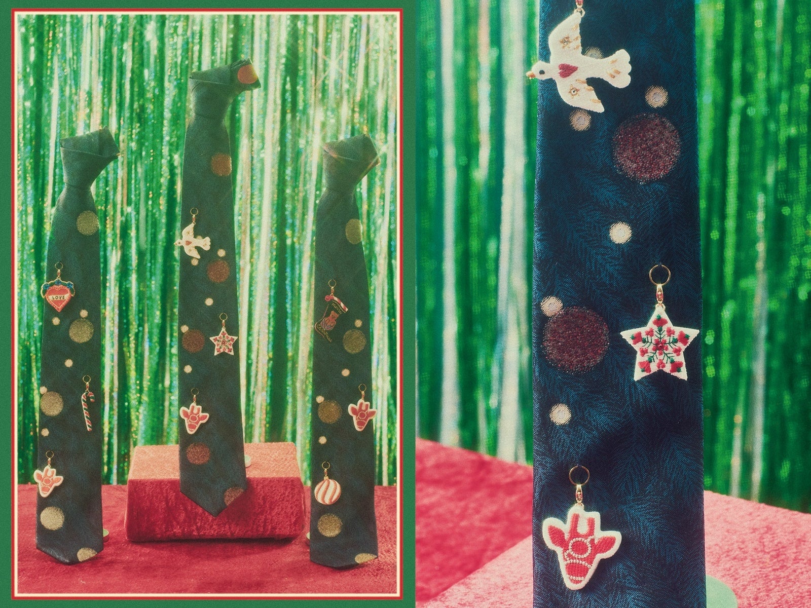 2024年の新作は、クリスマスツリーに見立てたネクタイに、オーナメントのような3種のチャームを着けて楽しむネクタイです。クリスマスムードが満点で、年末にかけての華やかなパーティーシーンや日常の装いのアクセントにおすすめです。