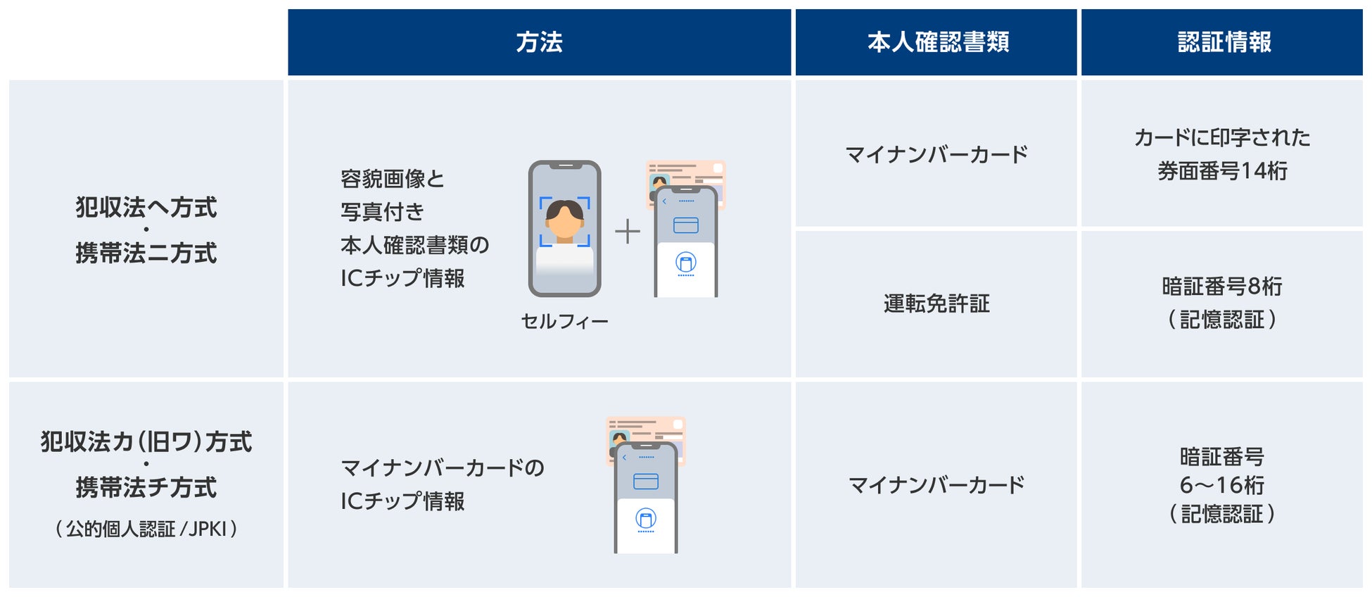 ※2 犯収法ヘ/携帯法ニ:運転免許証・マイナンバーカード、犯収法カ〈旧ワ〉/携帯法チ(JPKI)で比較。犯収法ヘ/携帯法ニ、犯収法カ〈旧ワ〉/携帯法チとは、犯罪収益移転防止法施行規則6条1項1号ヘ・カ〈旧ワ〉、携帯電話不正利用防止法施行規則3条1項ニ・チに準拠した方式を指す。