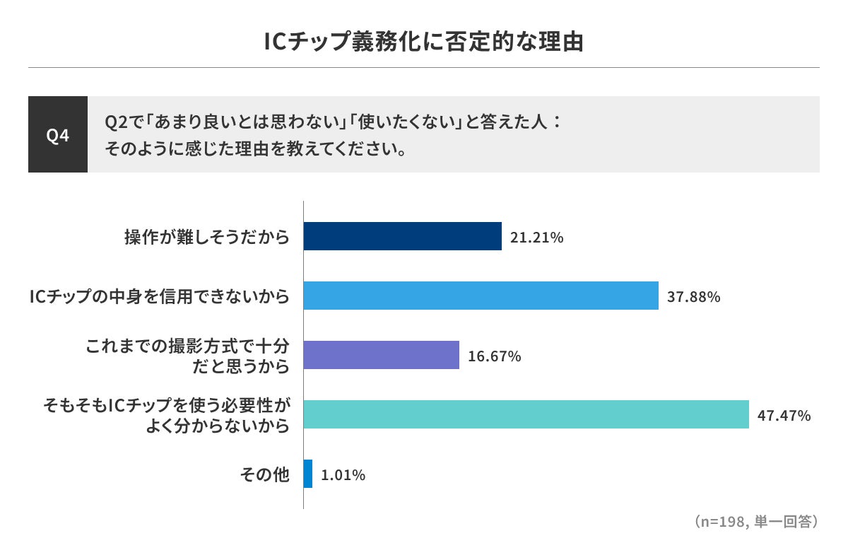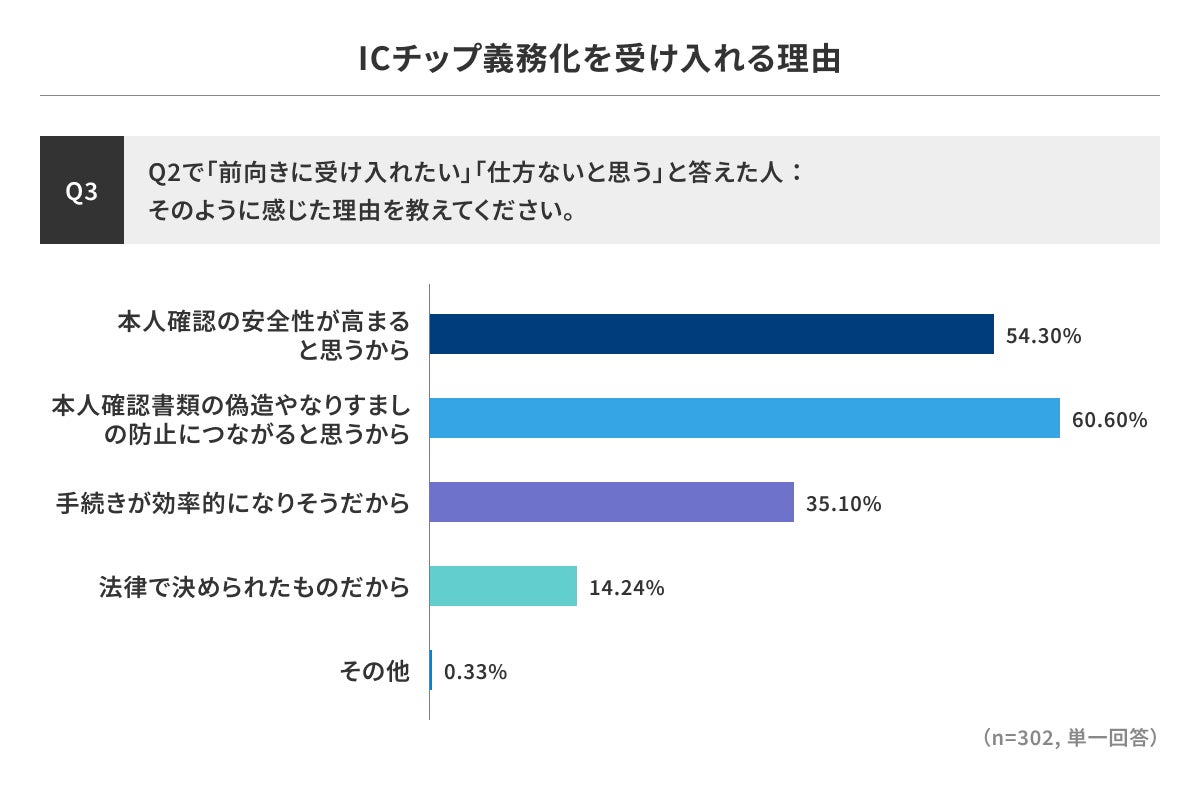 ICチップ活用の義務化について、「前向きに受け入れたい」「仕方ないと思う」と答えた人が6割を超えました。制度の詳細理解は進んでいないものの、一定の受容姿勢が見られました。義務化に理解を示す理由では、「偽造防止」(60.6%)や「安全性向上」(54.3%)など、安全面への期待を挙げる回答が多く見られました。一方で、否定的な理由では「必要性が分からない」(47.5%)、「ICチップの中身を信用できない」(37.9%)が多く、仕組みへの懸念も残る結果となりました。