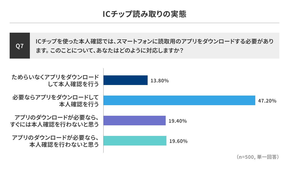 ICチップ利用時のアプリダウンロードについては、「必要なら行う」が最多の47.2%の一方、「すぐには行わない」「行わない」も39.0%で、一定の心理的ハードルが存在することがうかがえます。