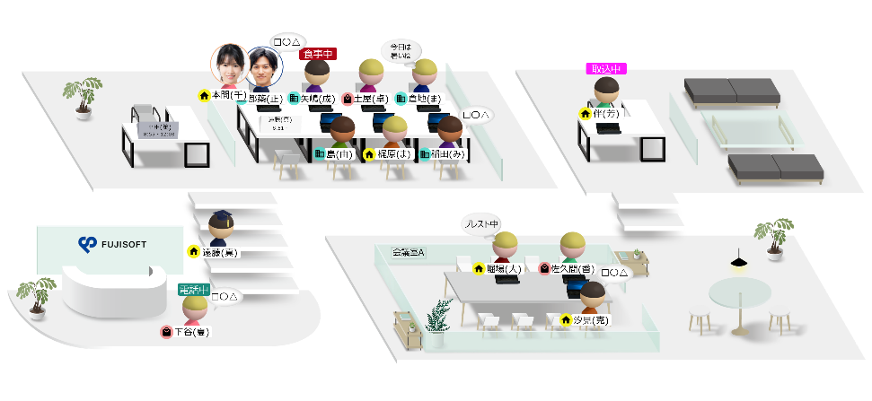 仮想オフィス空間FAMoffice(ファムオフィス)は、離れていても同じ空間にいるようにコミュニケーションが取れ、場所にとらわれない多様な働き方を実現する仮想オフィス空間です。社員の業務状況を俯瞰することができ、自身のアバターを相手のアバターに重ねるだけの簡単操作で気軽にビデオ通話を開始できます。