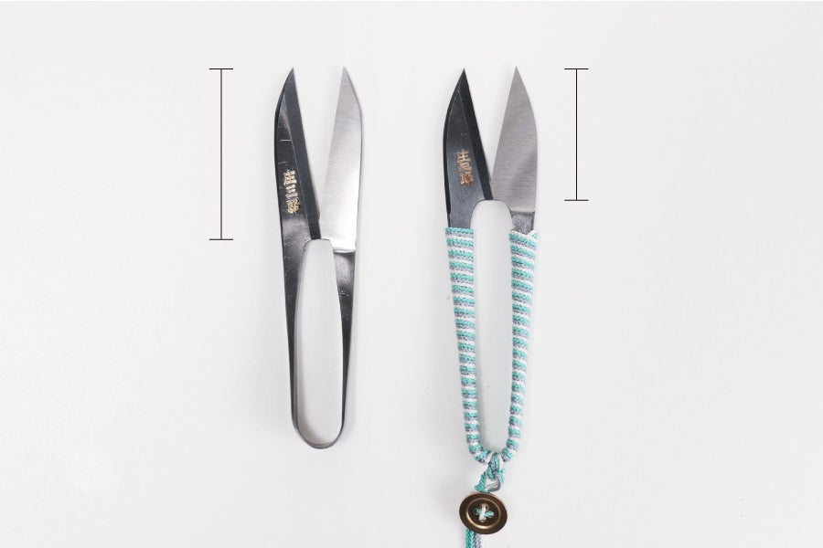 「庄三郎 長刃糸切ばさみ」と、惜しまれつつも廃番となった「庄三郎 伊賀くみひもの糸切ばさみ」を比べると、長刃タイプはより細身で、刃の部分が長い設計になっています。