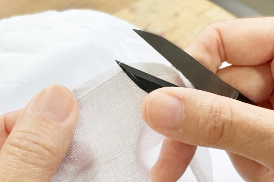本品に採用している「イブシ長刃 105mm」は、刃先が細く長い形状が魅力。ミシンの押さえ金の近くや刺繍が密集した部分など、標準タイプでは届きにくい奥まった場所にも刃を入れやすく、糸切りはもちろん、リッパー代わりに糸をほどく時にも活躍します。
