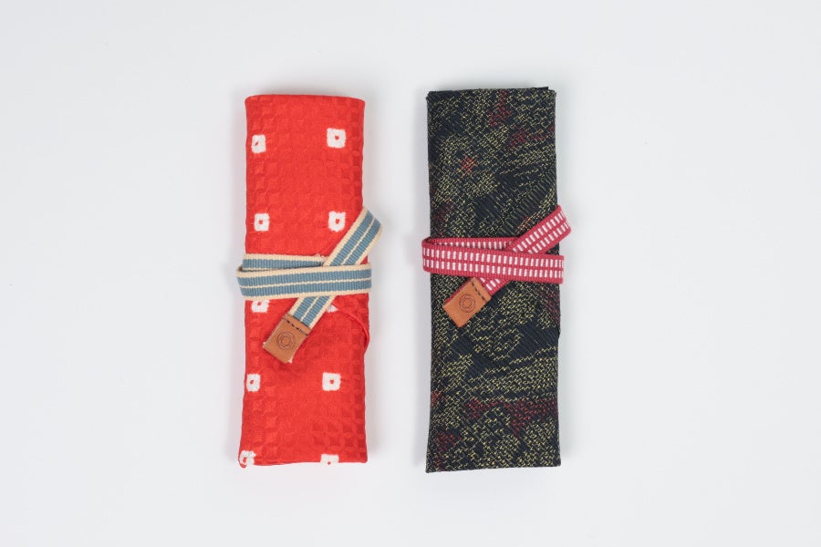 糸切ばさみを包むのは1970年代〜2000年代に作られ、仕立てられる機会のなかった着物の反物。ユニークで個性的な色味やデザインの反物を厳選し、小風呂敷に仕立てています。時代ごとの感性が残る生地との出会いを、ぜひご堪能ください。