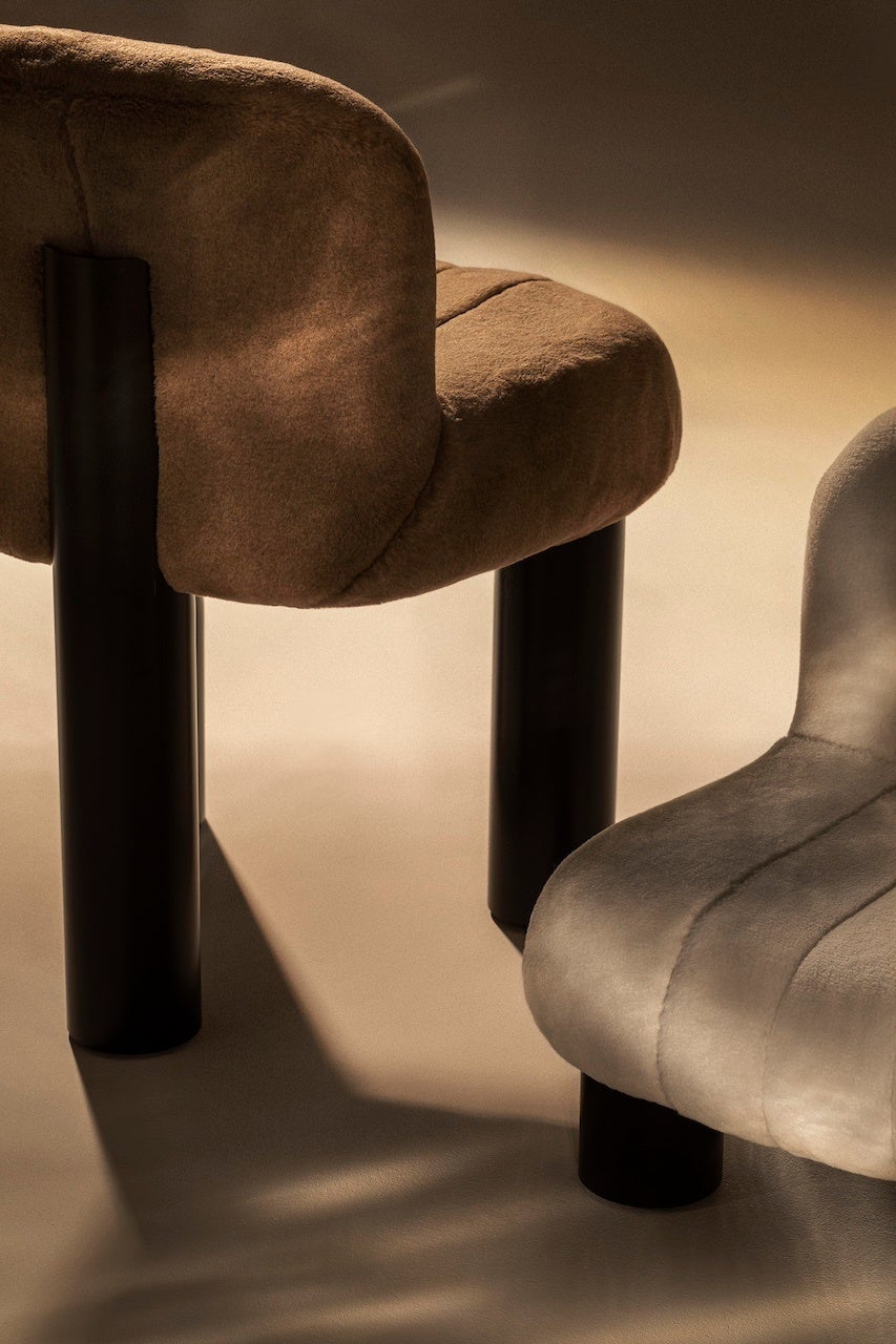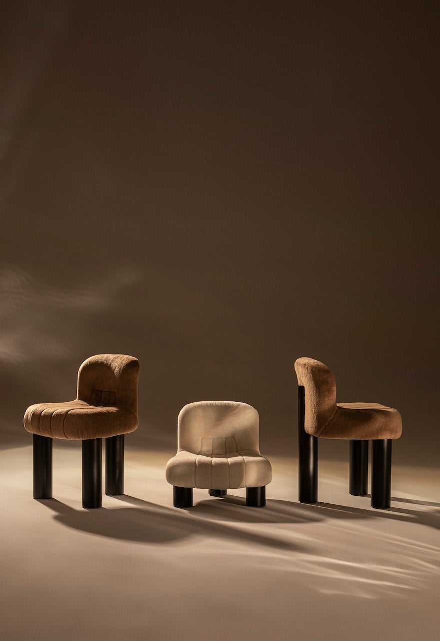 さまざまなエリアを探索することで、チニ・ボエリがデザインした最も有名な作品で1979 年にコンパッソ・ドーロ賞を受賞した、モジュール式のストリップス・システム、ストリップス・ベッド、ペコレレ・ソファとアームチェア、ボボとボボリラックスのアームチェア、ボトロ・ハイチェアとローチェアなどに出会うことができます。これらはすべて、洗練されたロロ・ピアーナ・インテリアのファブリックをまとっています。ボトロ・チェアは、カシミヤとシルクをブレンドした驚くほど柔らかいキャッシュファーで再解釈され、特別カラー、シリアルナンバー入りの限定100脚が製作されました。モジュール式のストリップス・ソファには、2つの色合いの無染色カシミヤとカシミヤ・ロー、ストリップス・ベッドとボボリラックス・アームチェアには、自然な弾力性と耐久性のあるティエポロウール、ボボ・アームチェアにはロロ・ピアーナのシグネチャーであるクンメルカラーのカシミヤ・シェルパの張地が施されています。ペコレレは、ニュージーランド産メリノ羊のダークカラーのフリースを加工した、独特な光沢のあるペコラ・ネラ®のファブリック張りが施され、羊の群れをイメージして常に2つの色調で構成されています。ロロ・ピアーナが独占的にウールを調達する羊の群れと同じように、柔らかく快適な暗い色調の「群れ」の中で、明るいペコレレが際立ちます。