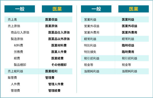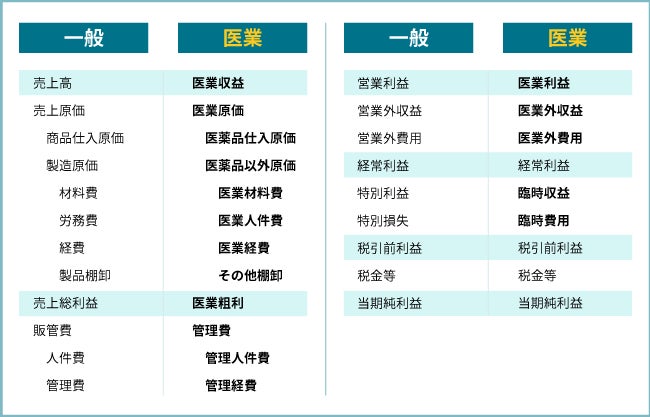 一般会計と異なるのは、損益計算書などにおける科目グループであり、例えば、売上高→医業収益、売上原価→医業原価などの違いはありますが、勘定科目の体系や配置が大きく異なるものではありません。