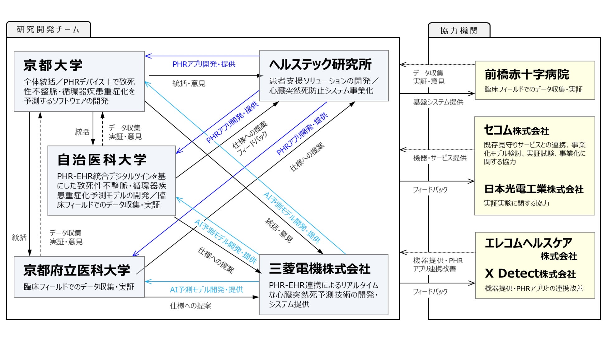 当社は京都大学と共同し、PHRデバイス上で循環器疾患重症化を予測するソフトウェア開発とライフログデータや症状を医師に共有するシステムの構築を通して、民間事業者が提供する見守りサービスと連携した心臓突然死予防や循環器疾患重症化予防に繋がる事業モデルの構築を目指してまいります。これにより、患者・家族は突然死リスクに関わるフィードバックだけでなく、AI予測に基づくリスクに応じた受診勧奨やホームAEDの提供、電話相談等見守りや安心を享受できる新しいサービスの社会実装を実現してまいります。