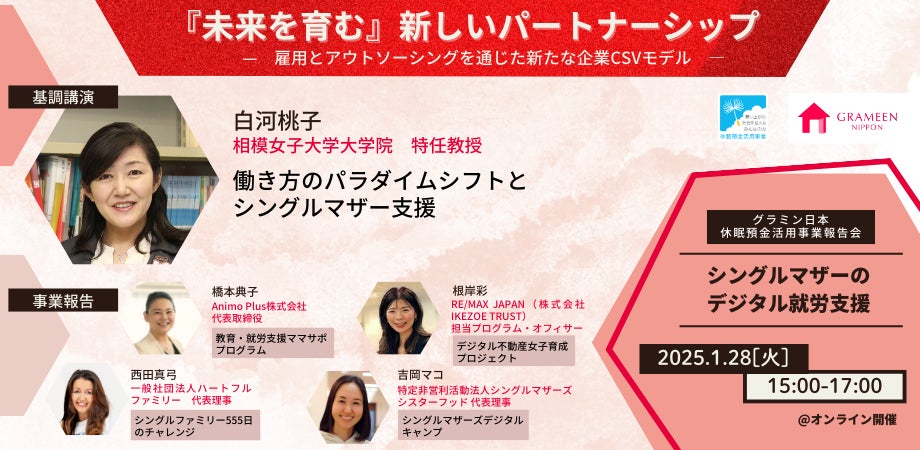 一般社団法人グラミン日本(所在地:東京都中央区、理事長:百野 公裕、以下「グラミン日本」)は、2021年度休眠預金活用「シングルマザーのデジタル就労支援」事業の報告会を、2025年1月28日(火)15:00からオンラインで開催いたします。