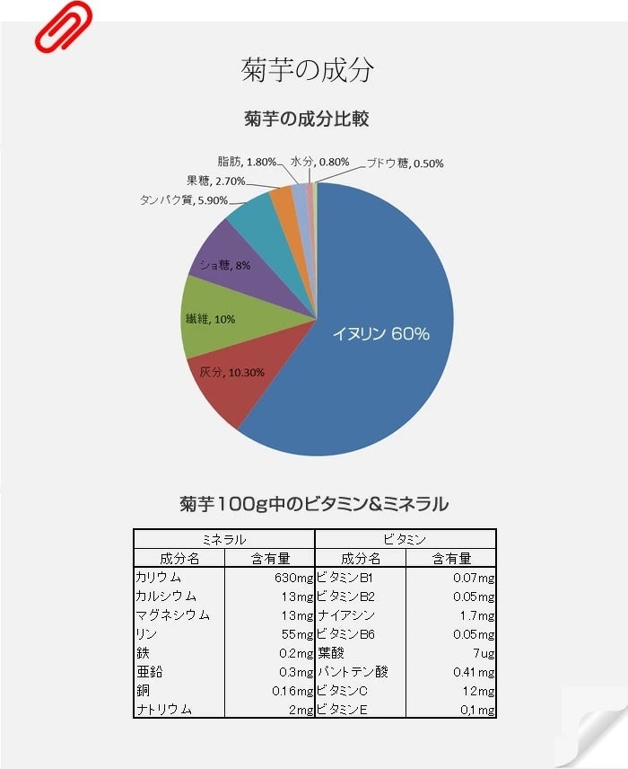 菊芋は北アメリカ原産のキク科の植物です。近年、日本でも大変に注目されて生産量を増やしています。昔、トビナンプー族と言うアメリカン・インディアンが食生活に取り入れていたものです。そこで注目を浴びた菊芋がヨーロッパに渡り、研究が進められました。 菊芋にはイヌリンという成分が含まれています。イヌリンは分解されるとフラクトオリゴ糖として働きます。フラクトオリゴ糖とは、ショ糖に1~3袋の果糖が結合したもののことで、難消化性のオリゴ糖に分類されます。