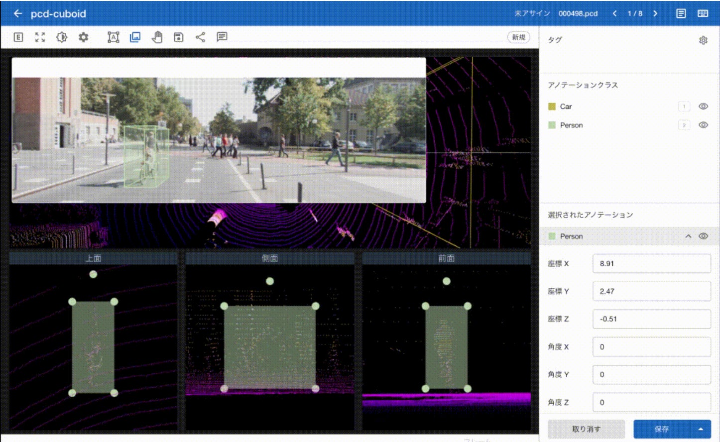 点群データに対応する画像データをアップロードすることで、アノテーションデータの3D-2D投影も可能です。