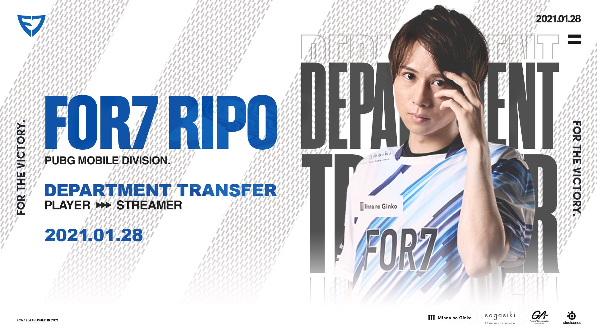 株式会社CS entertainment(本社:福岡県那珂川市、代表取締役:中村浩之)が運営するプロeスポーツチーム「FOR7」PUBG MOBILE部門のRipo選手が、「FOR7」ストリーマー部門へ移行いたします。