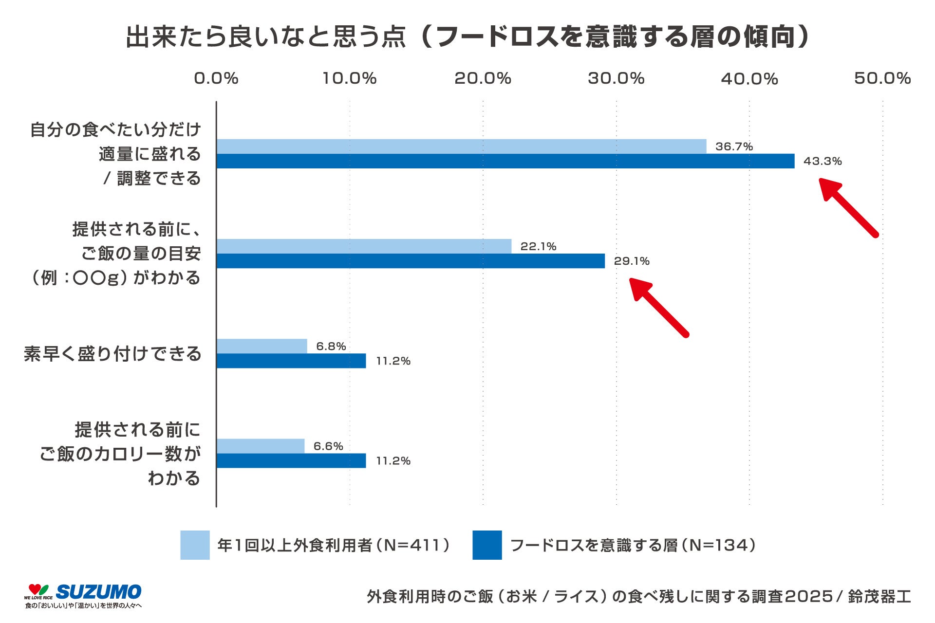 食品ロス削減のためには、消費者に精神的な負担を与えず、楽しい食事時間を提供することが‟美味しさ”に通ずる重要なポイントです。今回の調査では、そのために「事前に量がわかること」や「自分で量を選べること」が効果的であることが分かりました。特にフードロスを意識している人ほど、こうした仕組みを求める傾向が強く見られました。