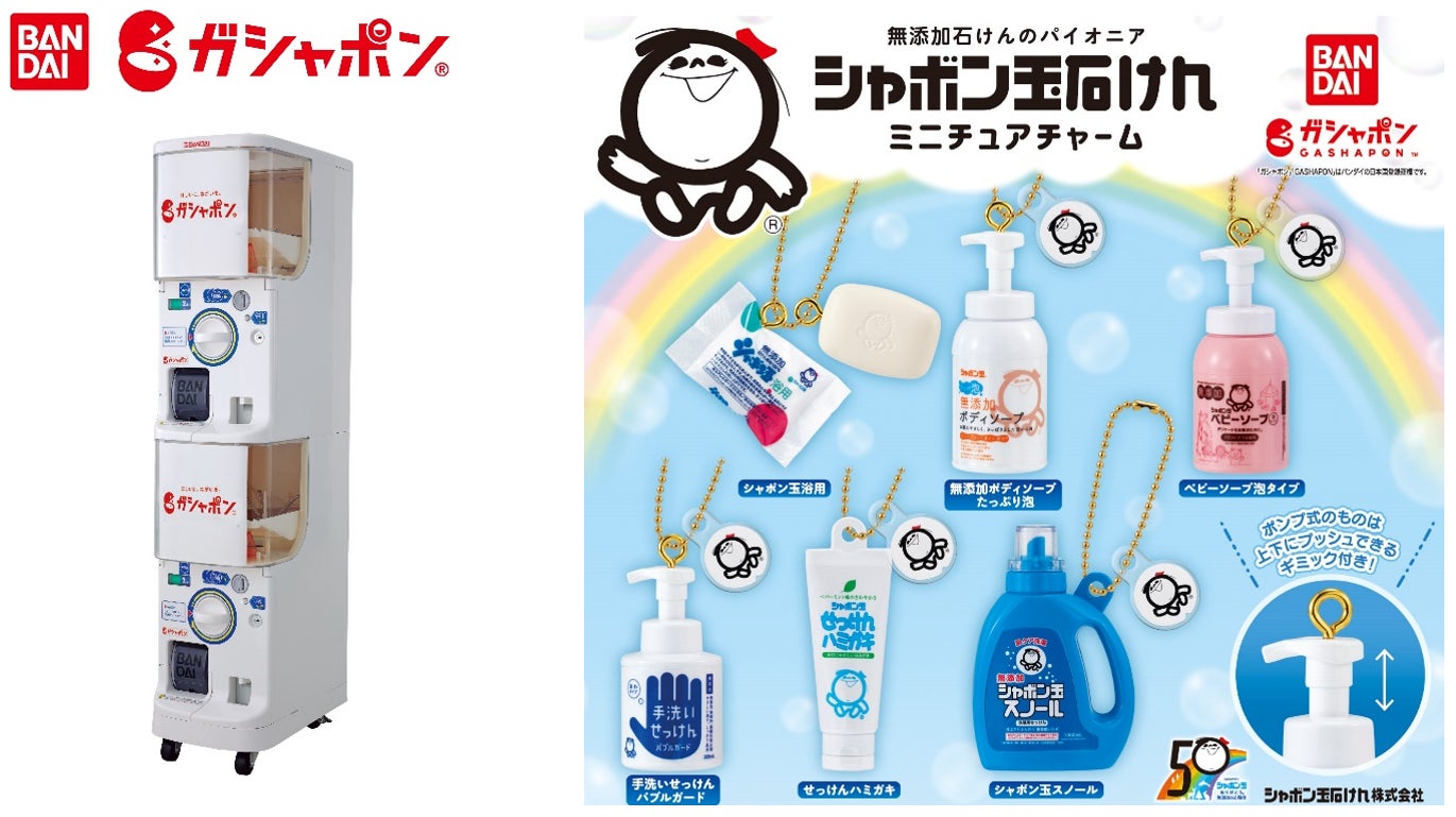当社の主力商品「シャボン玉浴用」「手洗いせっけんバブルガード」「シャボン玉せっけんハミガキ」などのパッケージを再現した「シャボン玉石けん ミニチュアチャーム」が、 株式会社バンダイのオリジナルカプセルトイブランド「ガシャポン®」にて2024年 11月第3週より順次登場、全国のガシャポン®バンダイオフィシャルショップ、玩具売場、量販店、家電店などに設置されたガシャポン®自販機シリーズで発売されます。
