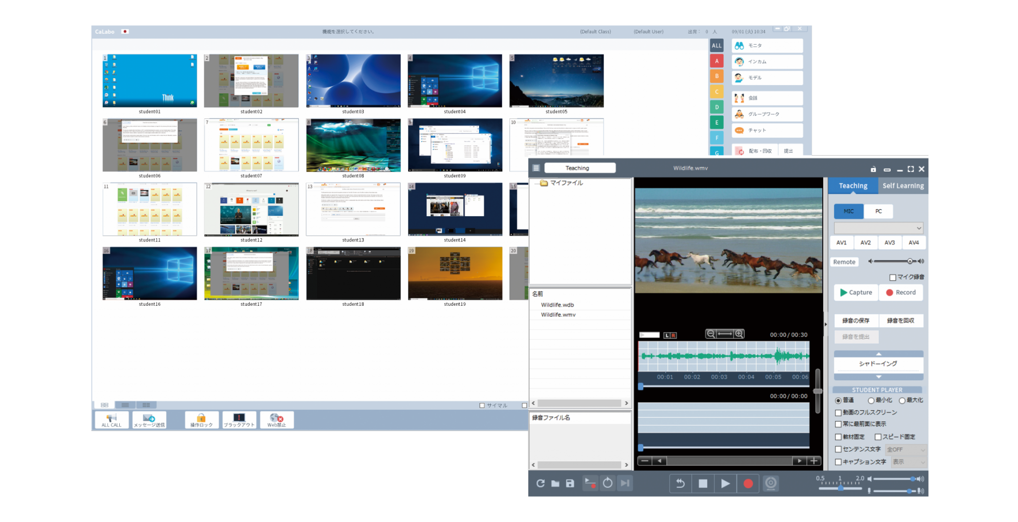 『CaLabo® EX』の特長の一つである動画学習ツール「ムービーテレコ」は、動画・音声教材をリアルタイムに配信しながら映像・音声と連動して音声波形を表示します。
