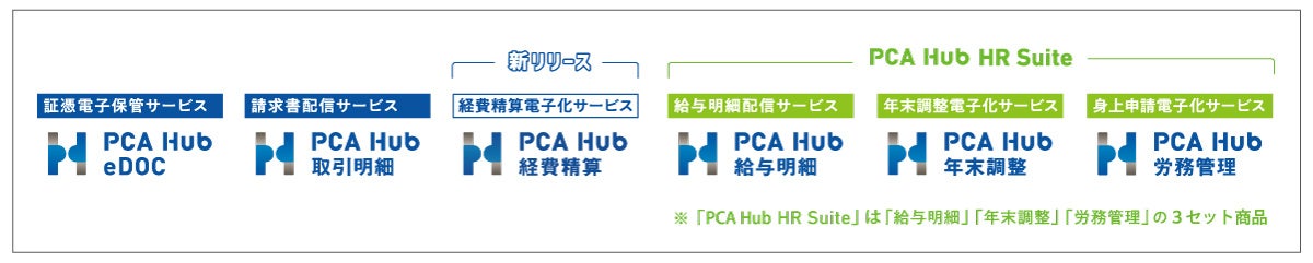 『PCA Hubシリーズ』は、"手に届く価格"で"手が届かなかった業務効率最適化"を実現するクラウド型の業務支援サービスで、『PCA Hub eDOC』、『PCA Hub 取引明細』、『PCA Hub 給与明細』、『PCA Hub 年末調整』、『PCA Hub 労務管理』、『PCA Hub 経費精算』がリリースされています。