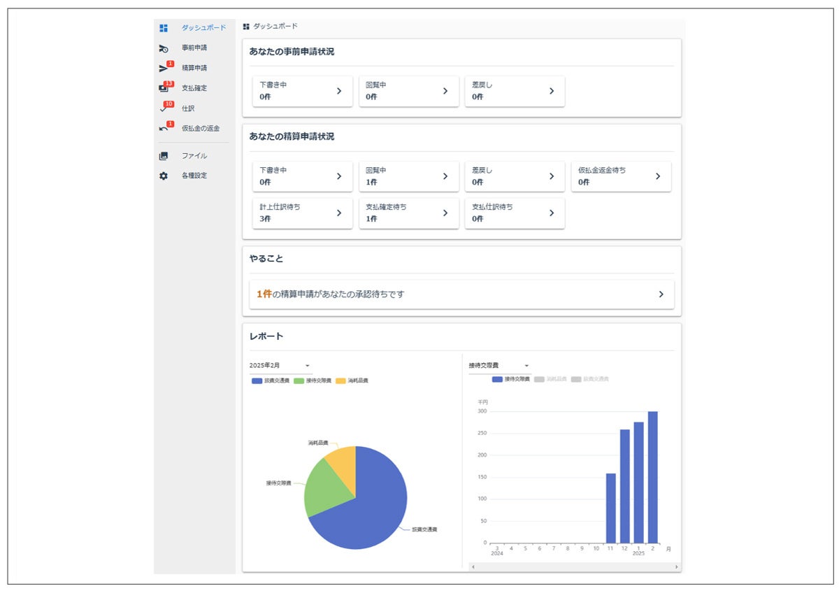 本サービスは、手間のかかる経費精算業務をデジタル化し、日々の申請・承認業務をスムーズに行うことができるクラウドサービスとなります。また、日々の対応業務はダッシュボードで管理でき、予実管理、仮払金の管理機能や交通費精算に必要な経路検索も搭載されています。経費精算業務のデジタル化により、作業効率化とコストダウンに貢献します。
