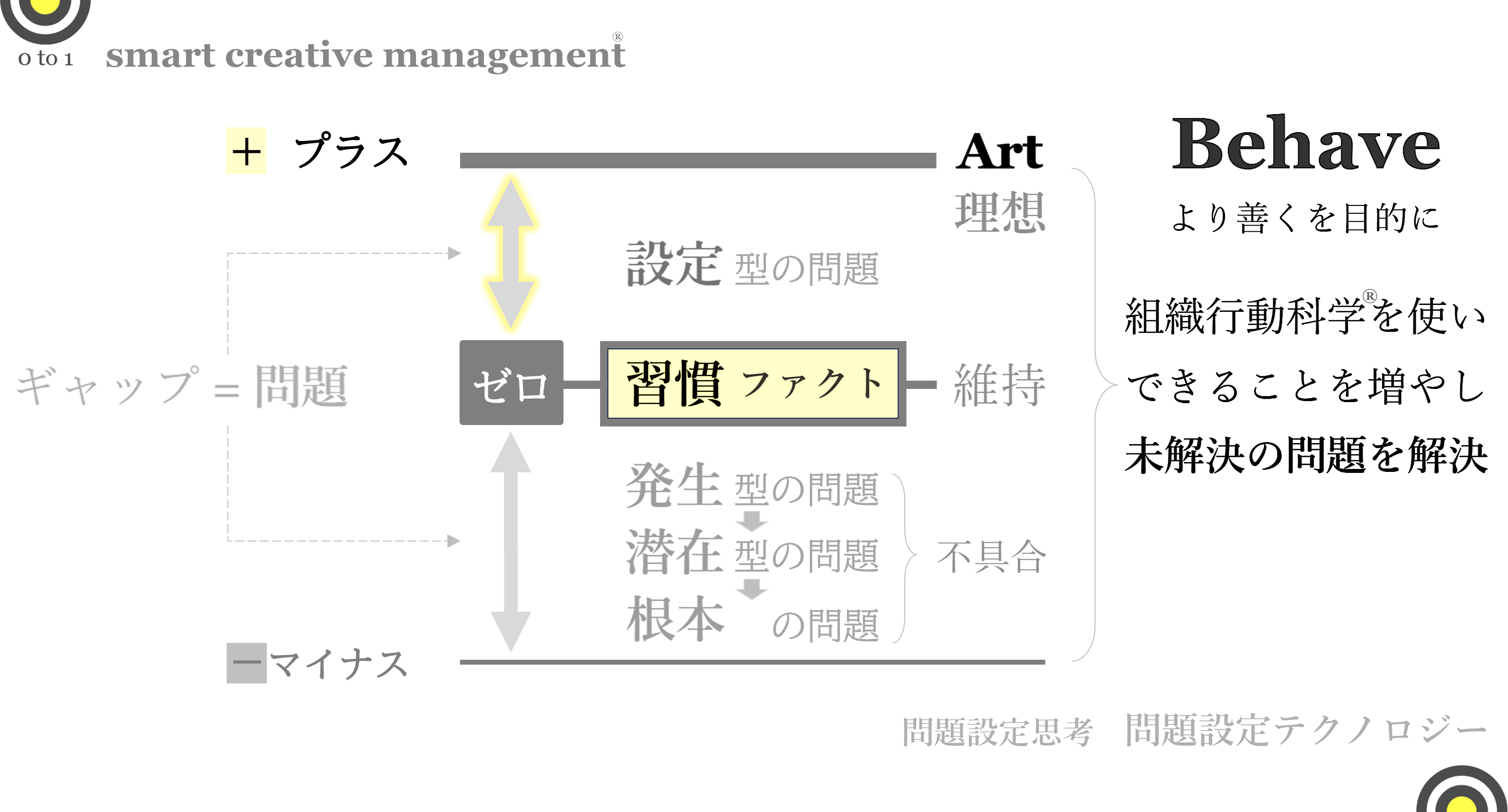 当初、ある特定の人が抱える問題を解決することが目的だったが、ある時点から、パターン(標準)で処理することが目的になる。それが上手にできる人が、高い評価を受け、プレイヤーからマネジメント職に引き上げられていく。組織にパターン(標準)がより浸透・定着していく。詳細は以下の【組織行動科学®】を参照ください。