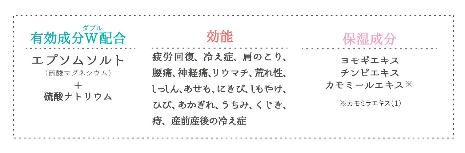 世界のセレブやスポーツ選手たちも大注目!人気沸騰中の話題のエプソムソルト(硫酸マグネシウム)を配合した医薬部外品の薬用入浴剤。肌あたりのやわらかい、まろやかなお湯が、身体を芯まで温め、疲れてこり固まった身体をやさしくほぐします。