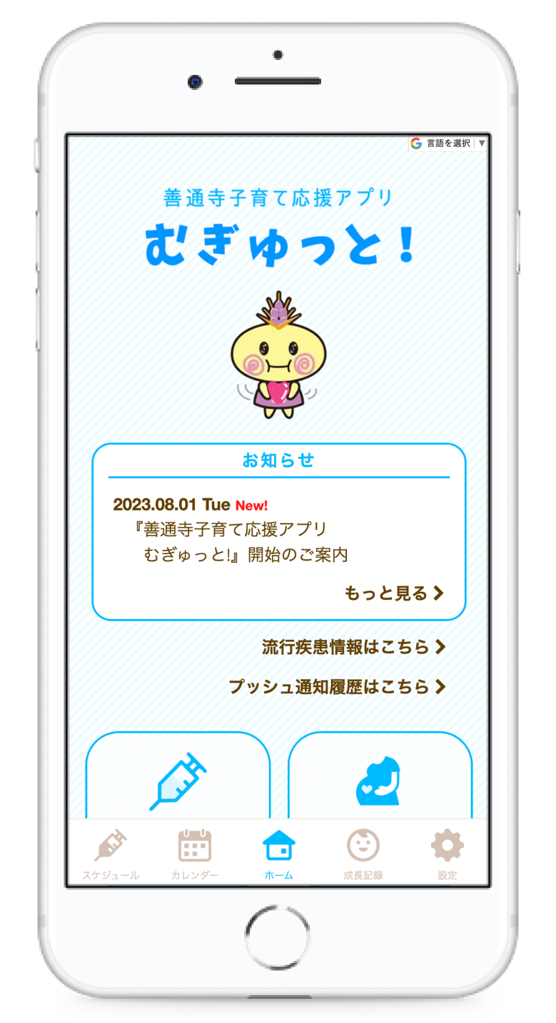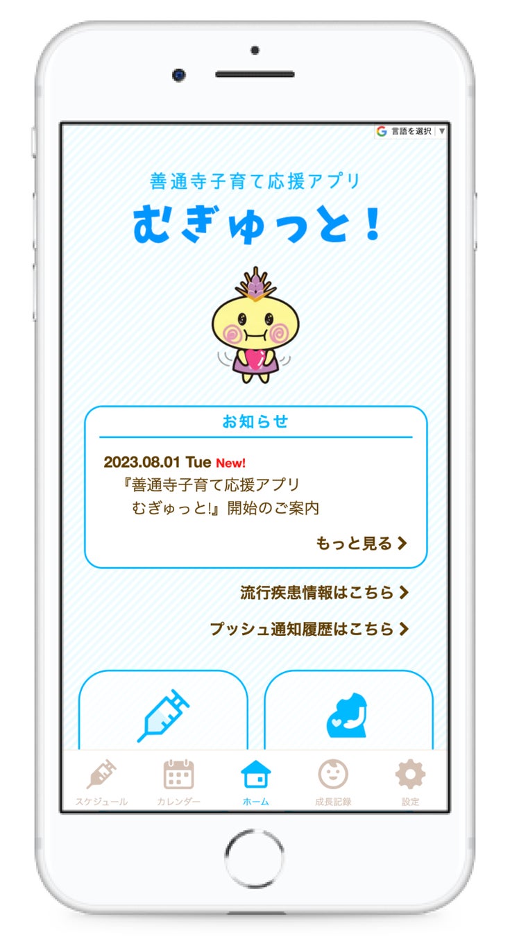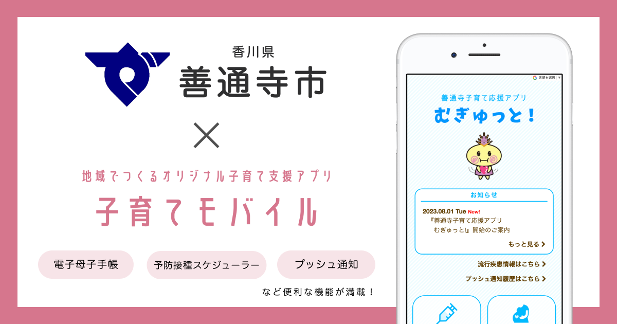 本市では、平成30年に「母子健康手帳アプリ」を導入し、子育て世代の皆様にご活用いただいておりましたが、この度、ライフスタイルの多様化による子育て世代のニーズに対応し、より一層「安心して子どもを産み育てられる」環境を整えるため、健診・予防接種等のタイムリーな情報提供と、個人管理機能を持つ、子育てモバイル「善通寺子育て応援アプリ むぎゅっと!」を導入することとしました。