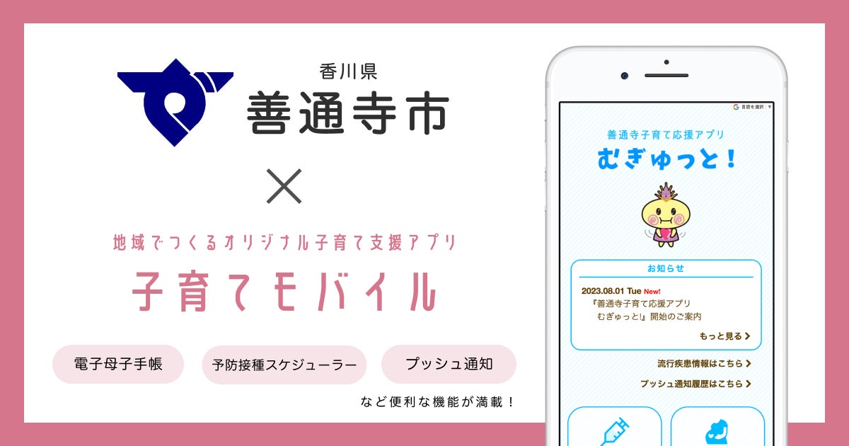 自治体向けサービスを開発する株式会社ミラボ(本社:東京都千代田区、代表取締役:谷川一也、以下「ミラボ」)の子育て支援アプリ「子育てモバイル」が、香川県 善通寺市に導入され、「善通寺子育て応援アプリ むぎゅっと!」として8月1日より提供を開始しました。