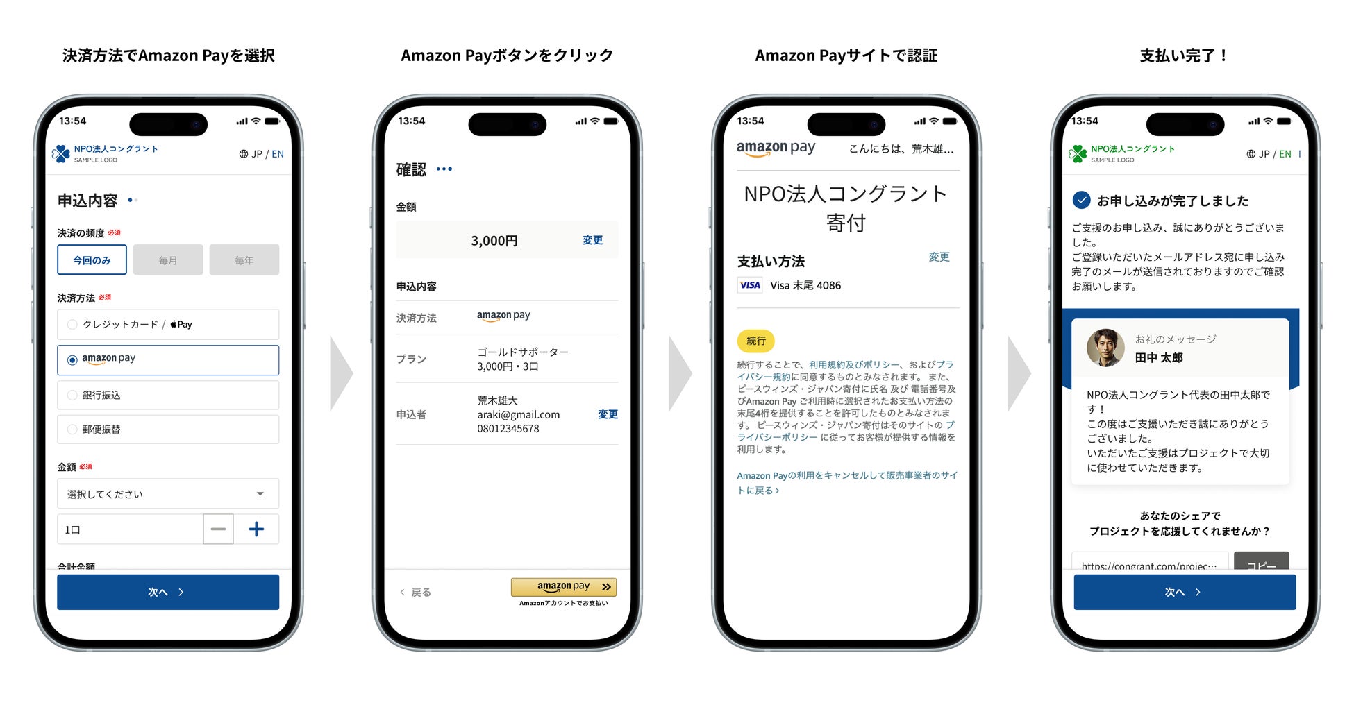 この度、寄付・募金の新しい支払い手段として「Amazon Pay」をコングラントの決済機能に拡充しました。Amazonアカウントを持つユーザーは、Amazonアカウントに登録されたお支払い方法を利用して、クレジットカード情報の入力は不要で寄付ができるようになります。