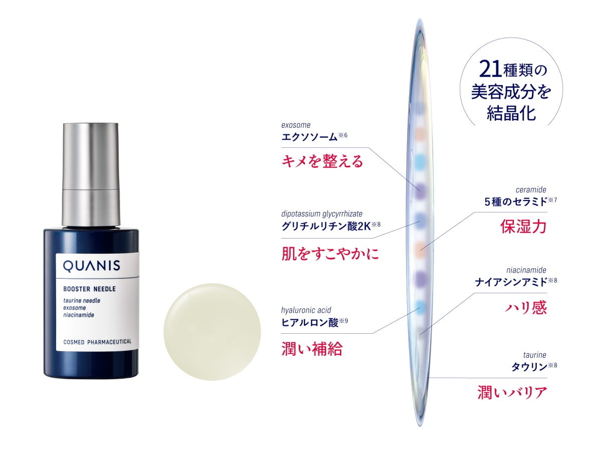 『QUANIS(クオニス)』新アイテムのブースターとクリームには、コスメディ製薬が世界で初めて※3実用化した「塗って、刺して※1、溶ける」マイクロニードルを搭載しています。