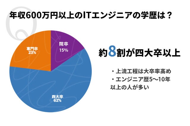 アンケートで年収600万円以上と回答したITエンジニアのうち、77%が四大卒以上であることが分かりました。