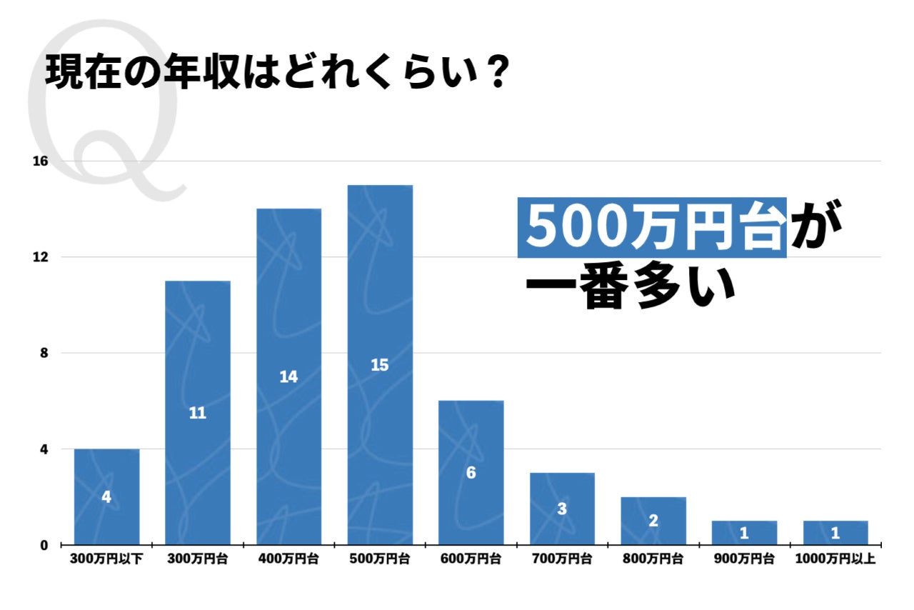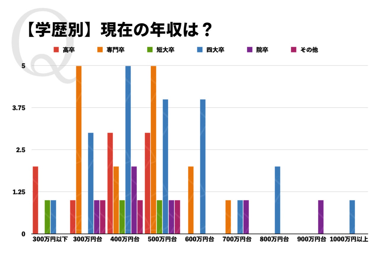 とはいえ、どの学歴でも300万〜500万円台が多く、この範囲では学歴による大きな差は見受けられません。
