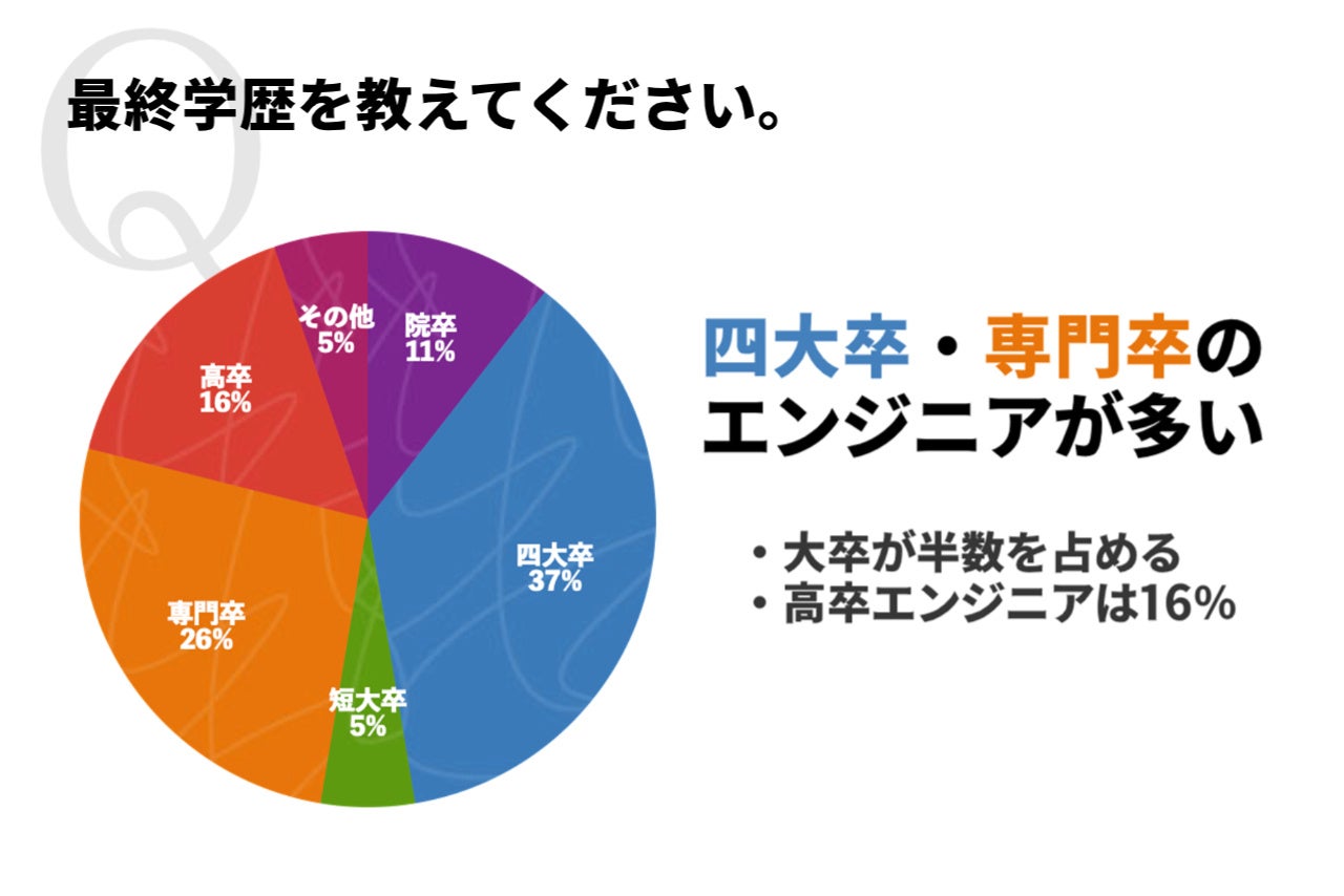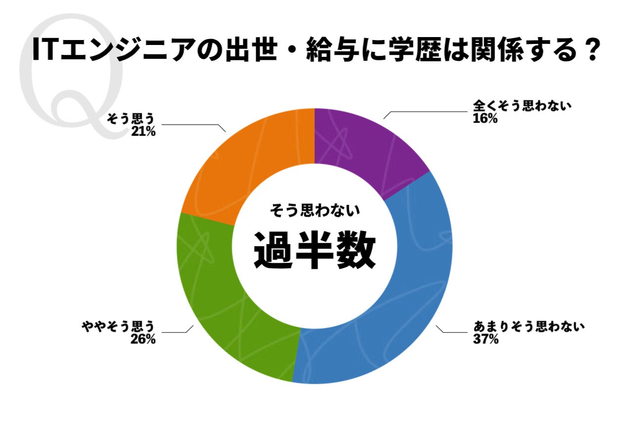 今回のアンケートでは、ITエンジニアは学歴関係なく働くことができる一方、高収入を得ているエンジニアは大学卒が多いことが分かりました。