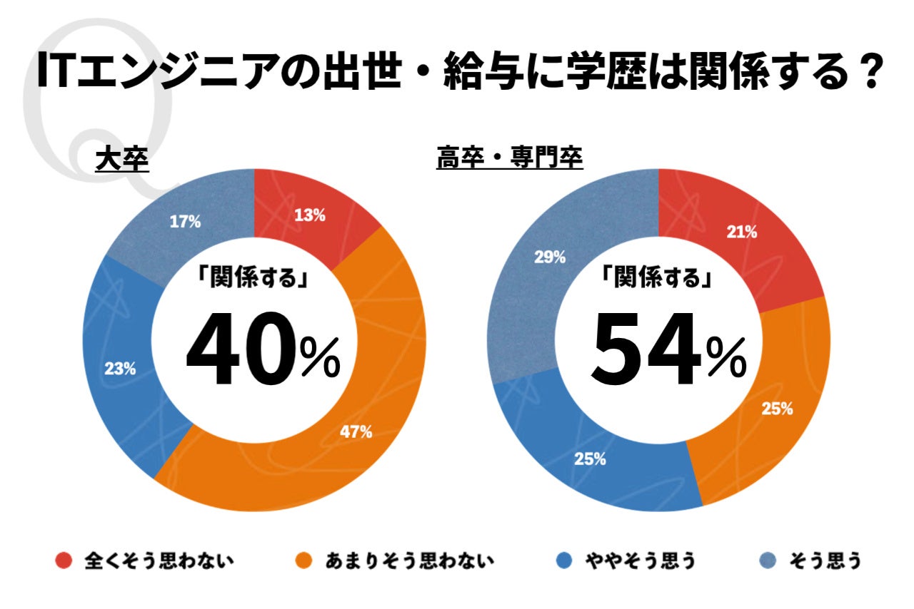 高卒や専門卒のITエンジニアは大卒エンジニアより、「学歴が関係する」と感じている人が多いことが分かりました。