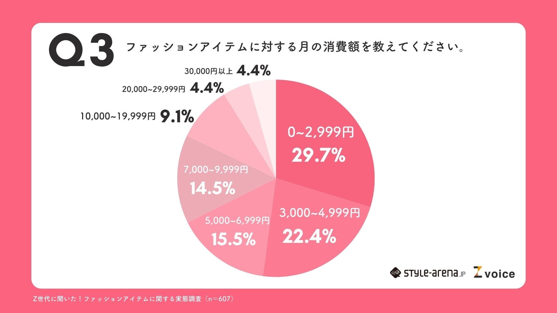 続いて、ファッションアイテムに対する月の消費額は2,999円以下が1番多く29.7%。また、8割以上のZ世代が月の消費額は1万円未満と回答しました。
