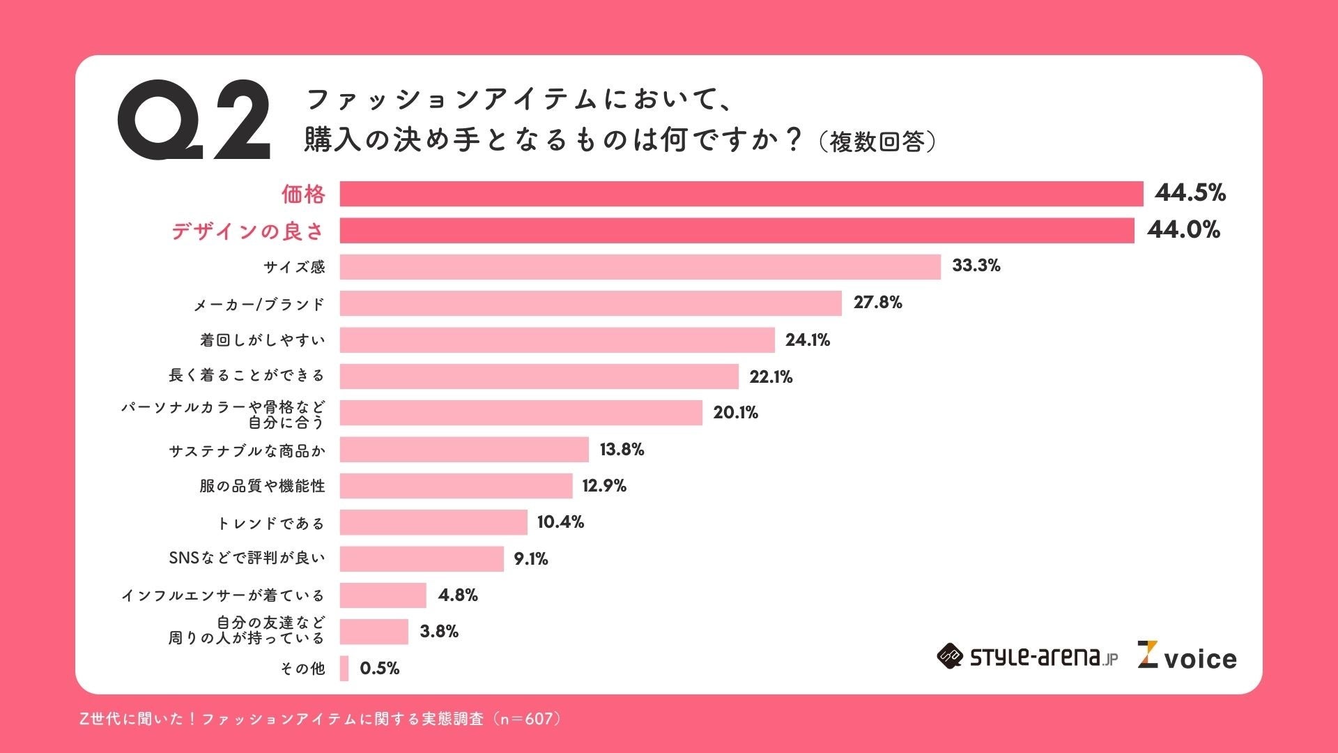 また、「ファッションアイテムにおいて、購入の決め手となるもの」に関しては、1位は「価格」で44.5%、次に「デザインの良さ」が44.0%で、この2点が圧倒的に多い結果となりました。