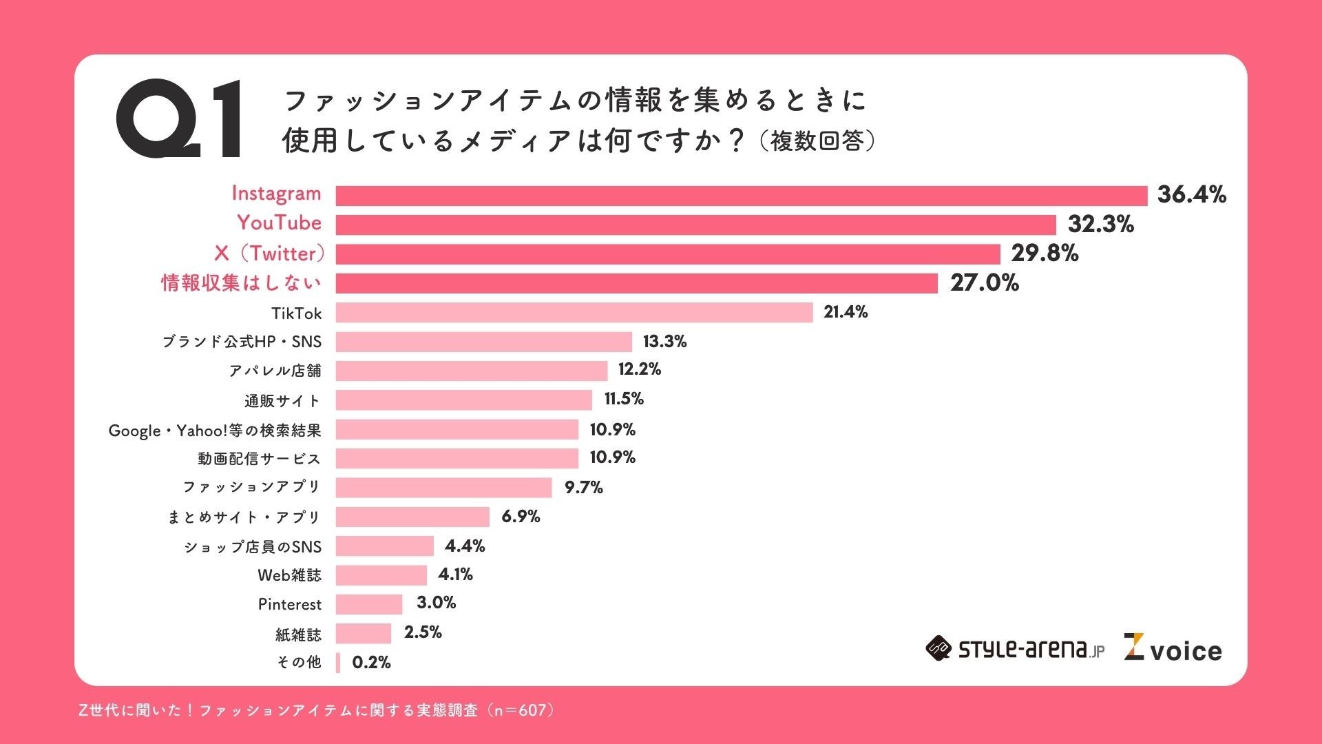まず、「ファッションアイテムの情報を集めるときに使用しているメディアは何ですか?」という質問に対して、1位がInstagramで36.4%、次にYouTubeで32.3%、次にXが29.8%とSNSの影響力の強さが窺える結果になりました。