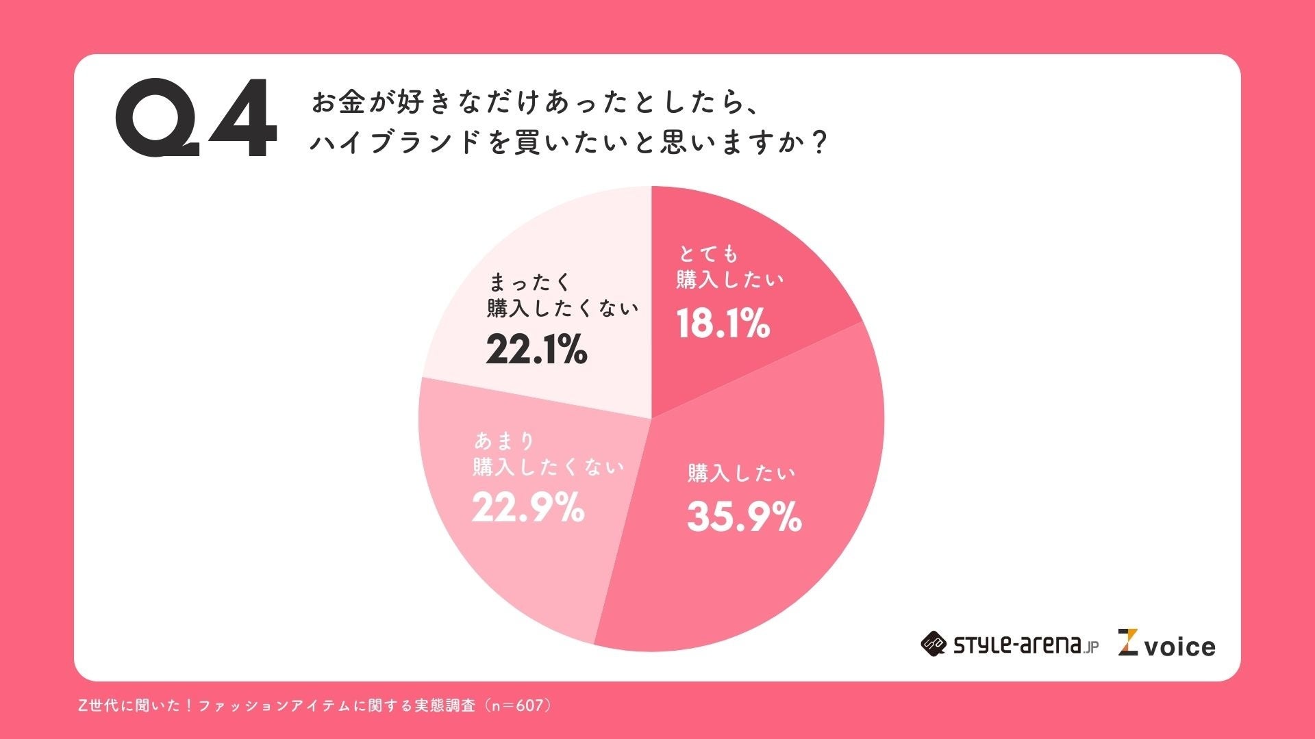 最後に、「お金が好きなだけあったとしたら、ハイブランドを買いたいと思いますか?」という質問に対して、「とても購入したい」「購入したい」の合計は54.0%と約半数という結果になりました。