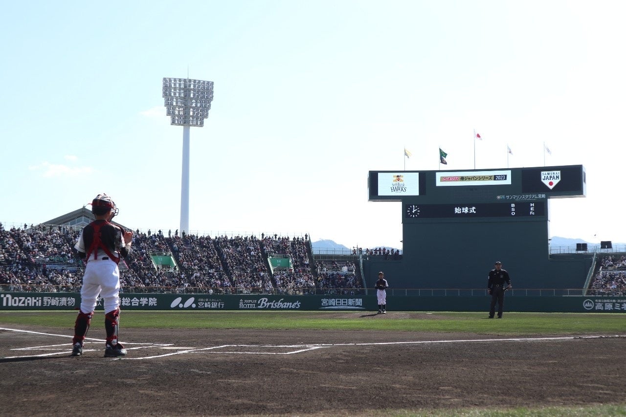 2023年2月25日(土)、26日(日)にひなたサンマリンスタジアム宮崎にて、野球日本代表侍ジャパンの走行試合『カーネクスト侍ジャパンシリーズ2023』侍ジャパンVS福岡ソフトバンクホークス戦が開催されました。2日目の日程となる2月26日(日)の試合前に、始球式が開催されました。