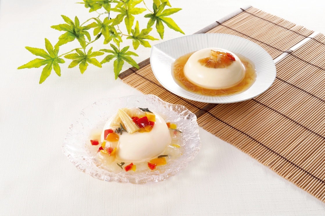 なめらかな食感の葛寄せとうふの上に、奥深い旨みの「フカヒレあん」や優しい美味しさの「彩り野菜あん」をかけてお召し上がりください。