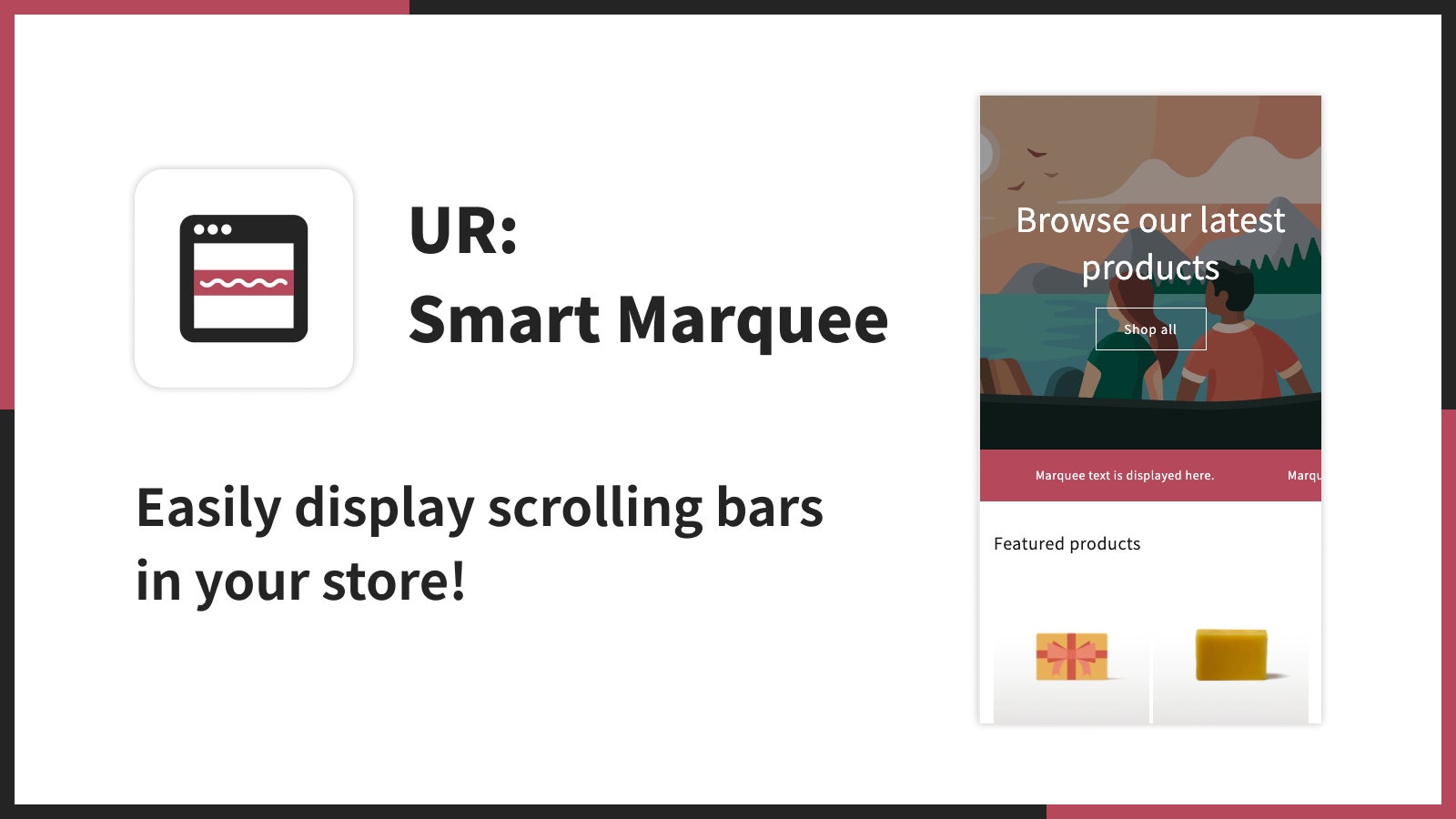 「UR: Smart Marquee」は、EC ストアに流れる告知を導入できるアプリです。流れる告知を導入することで、顧客へメッセージを効果的に伝えることができます。また、このアプリは対応言語を英語として提供しているため、世界中のさまざまなストア運営者が利用できます。