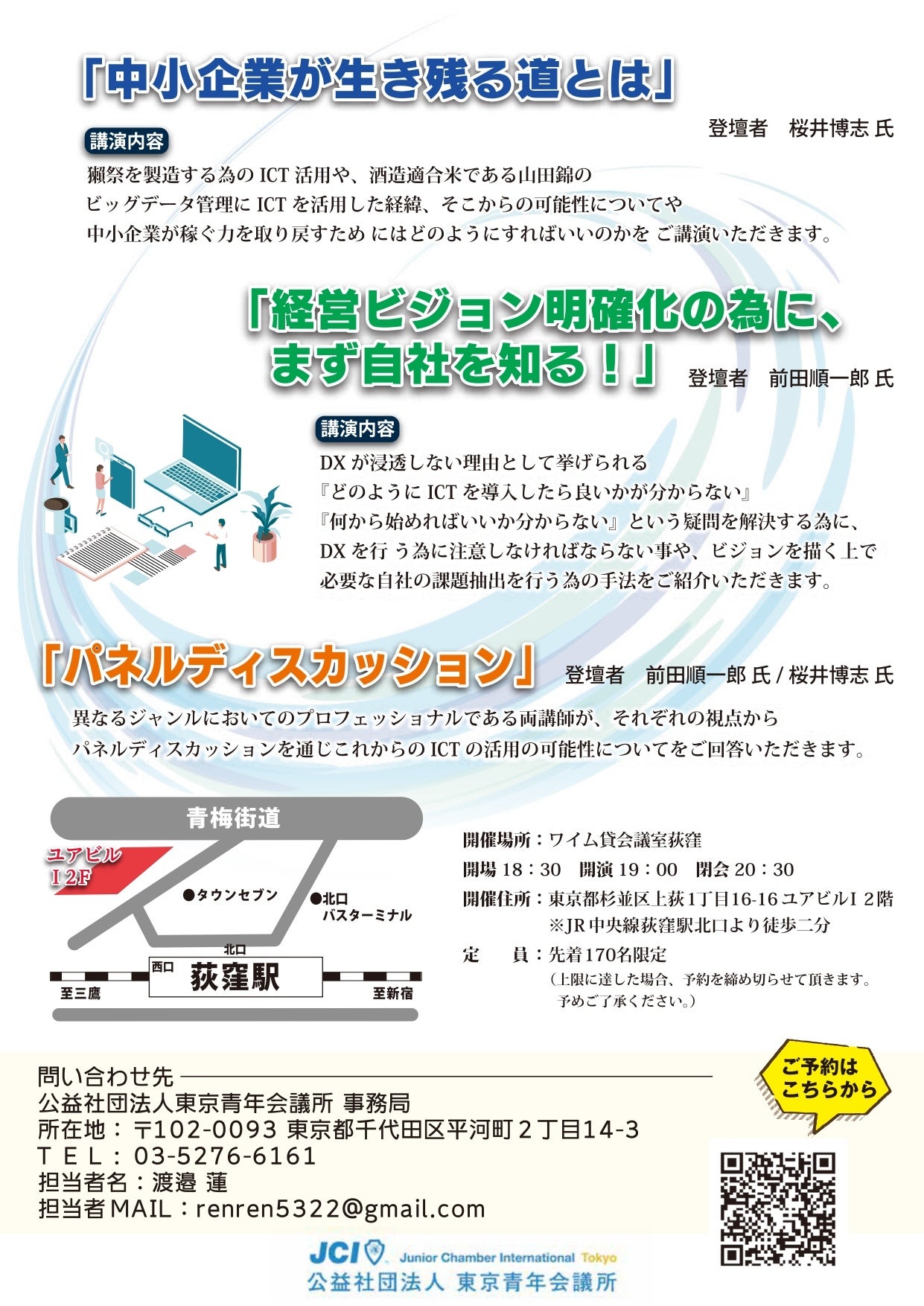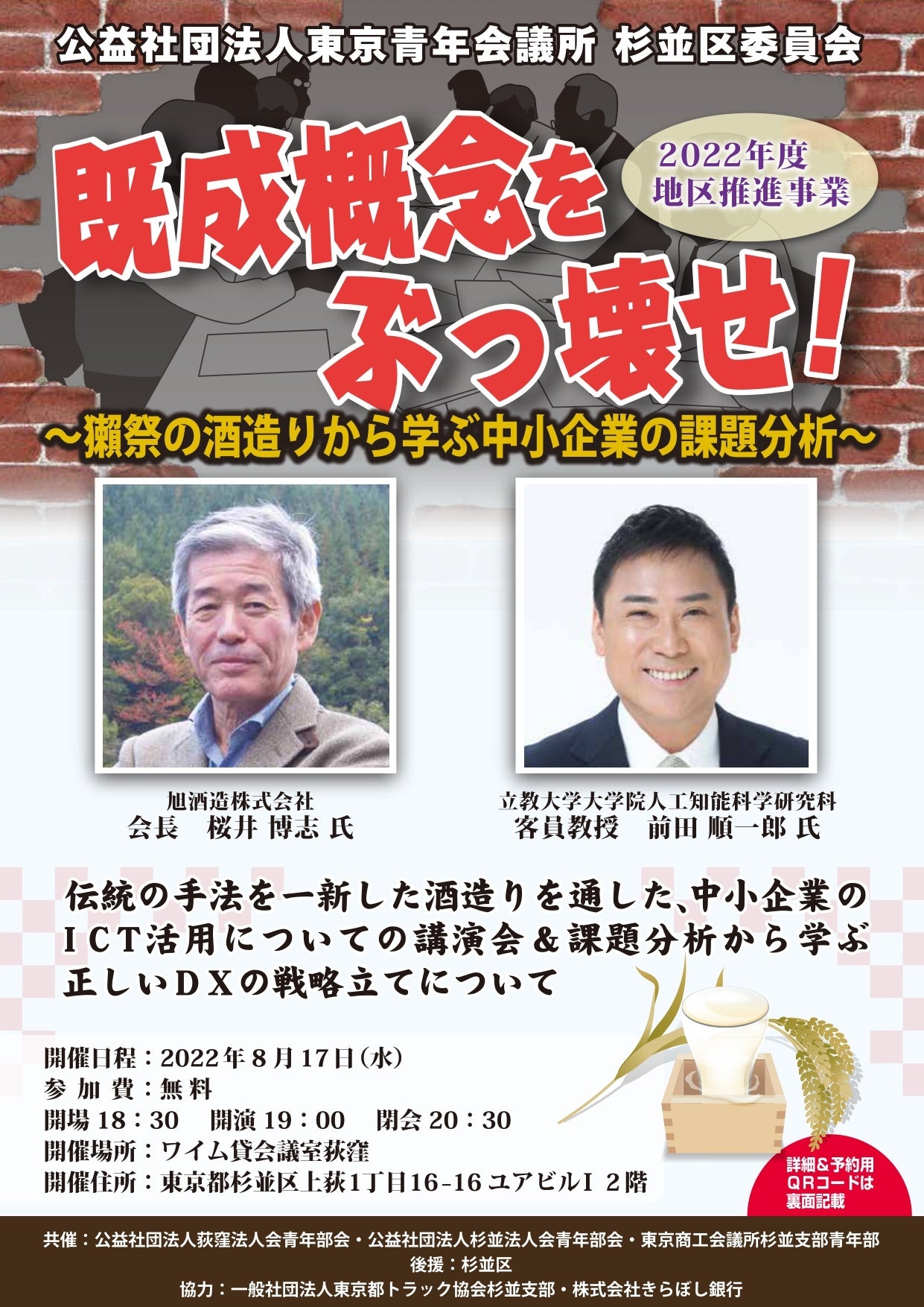 公益社団法人東京青年会議所 杉並区委員会(所在地:東京都千代田区平河町、理事長:山本健太)は、2022年8月17日(水)19時~「~既成概念をぶっ壊せ!獺祭の酒造りから学ぶ中小企業の課題分析~」を、ワイム貸会議室荻窪(東京都杉並区上荻1丁目16−16 ユアビルⅠ 2階)にて開催します。