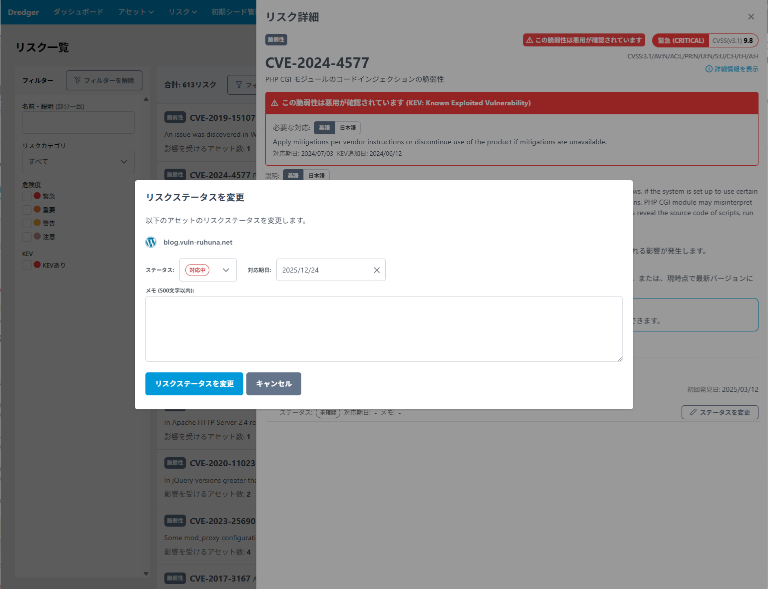 検出されたリスクに対して、以下のステータス、対応期日、メモを追加し、管理できる機能を追加しました。