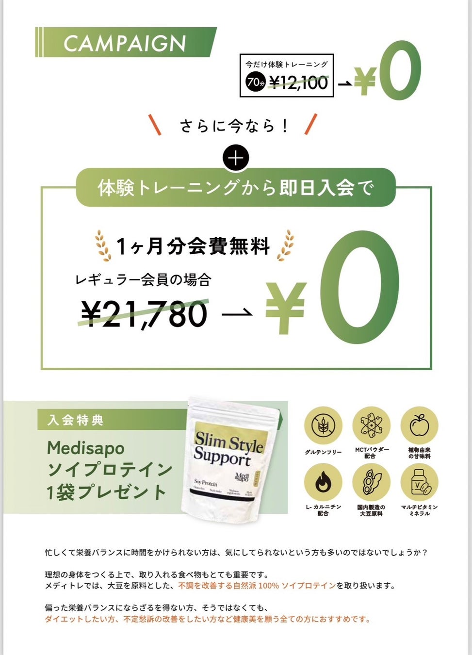 「トレーニング×コンディショニング×ドクター」パーソナルトレーニングジムMediTRAで新規入会時大人気のソイプロテインのプレゼントキャンペーンを実施いたします