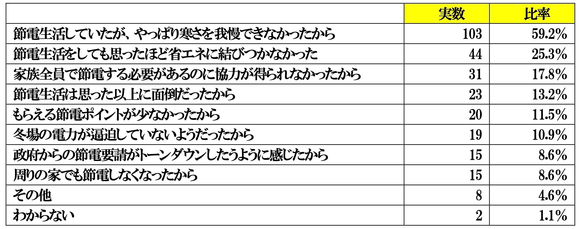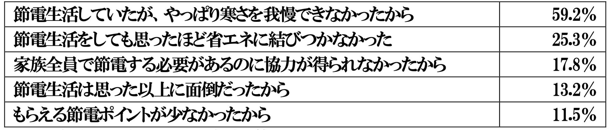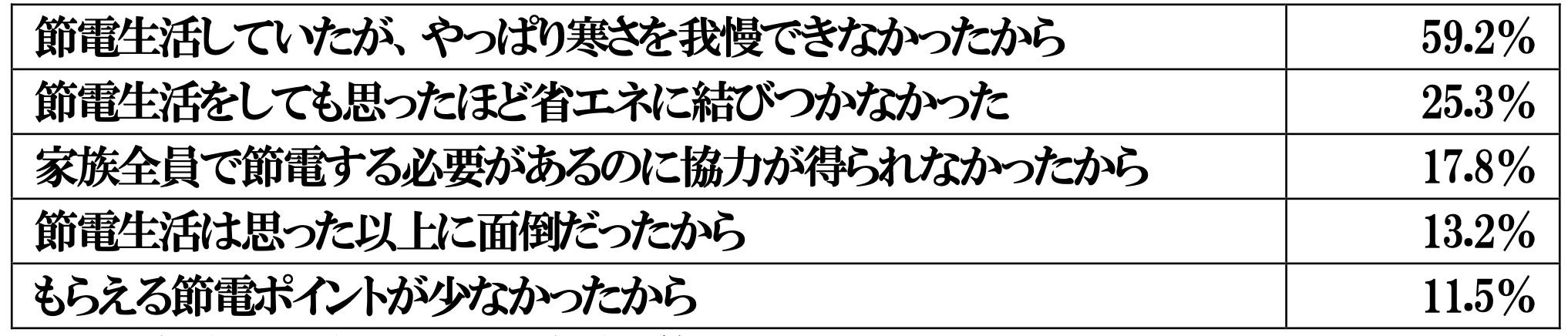 今冬は、政府から家庭における節電の要請があったことから、事前調査の結果、6割以上の方が「節電に取り組んでいる」ことが分かりました。事前調査で節電している方々に現在(23年1月末時点)の節電の取り組み状況を確認したところ、今も頑張って節電していると回答した方が66.2%になり、節電に対して若干トーンダウンしている傾向があることが判明しました。さらに、今冬の自宅での節電を若干トーンダウン、大幅にトーンダウン、節電しなくなった方々に、その理由を複数回答で質問したところ、「寒さを我慢できなかったから」が最も多く59.2%、「思ったほど省エネに結びつかなかった」25.3%となっており、強い寒波の影響などからトーンダウンしてしまったものと推測できます。