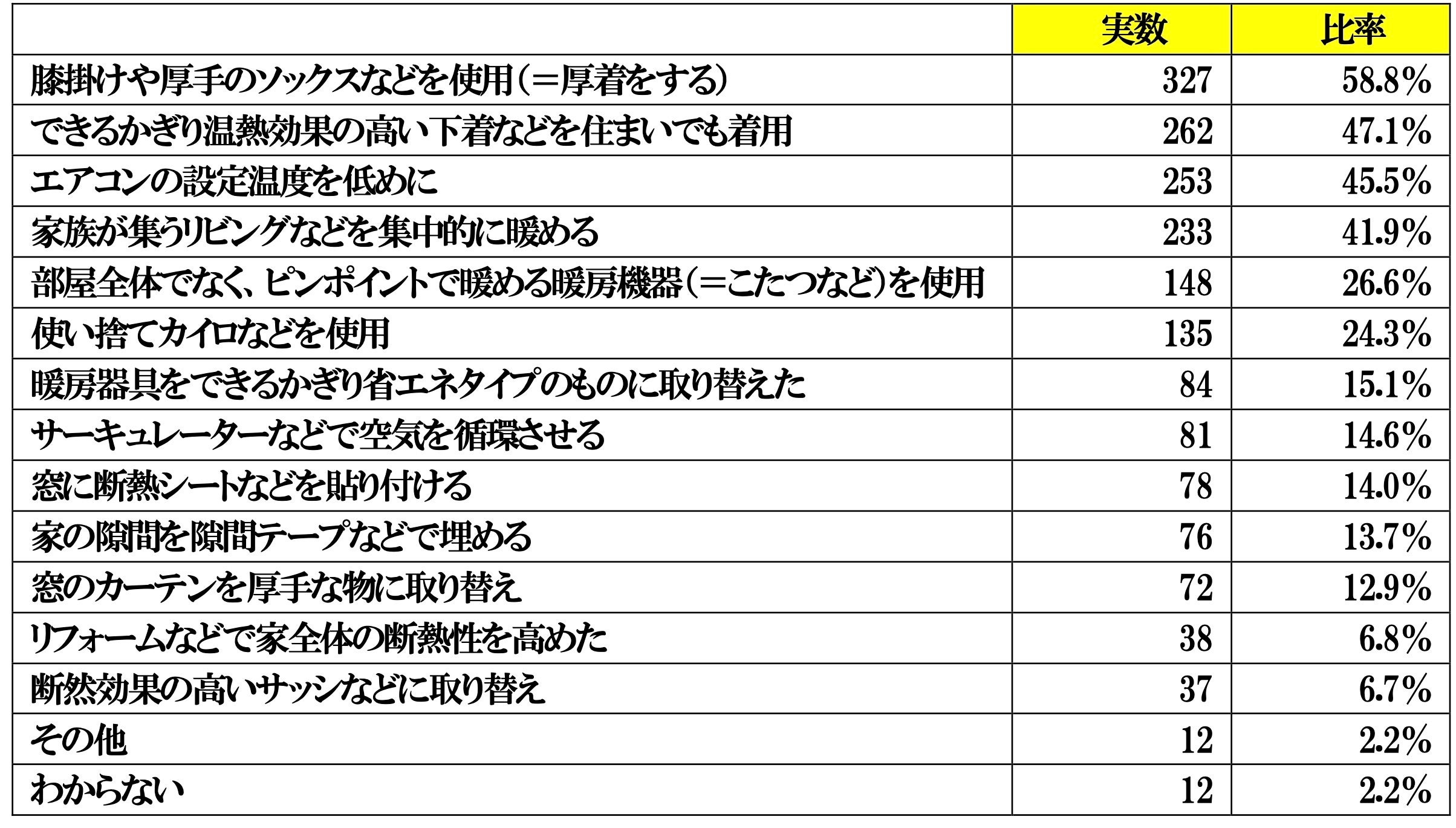 さらに、節電の方法としては、最初はエアコンなどの熱源を使用せずに厚着で対応し、それでも厳しくなってきたらエアコンなどの熱源を工夫して使用、さらに寒い場合は、建物の断熱性能を高めて消費電力を減らす、という流れで節電に取り組んでいるものと思われます。またこの結果から、浴室などの服を脱ぐ場面やエアコンなどを使用していないトイレや廊下などでのヒートショックの発生が懸念されます。