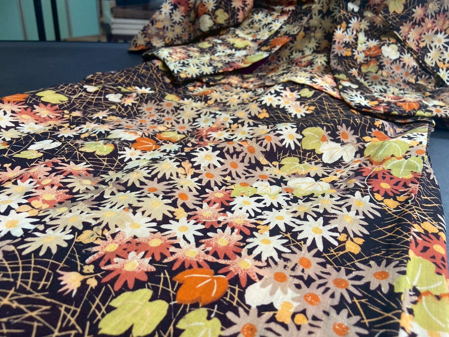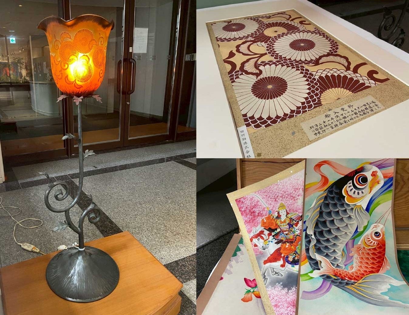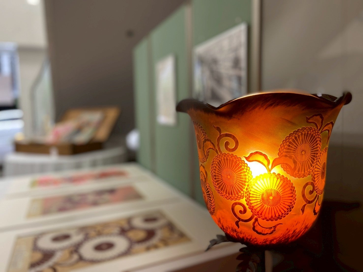 タペストリーとともに、実際に使用していた籠、そろばん、看板や、「意匠の田村駒」と称される所以となった実際の意匠図案、田村駒製ウールモスリンの着物、日本柄金巾更紗「傘菊」をモチーフにしたスタンドランプ等も併せて展示いたしました。よりリアルに歴史を感じていただけたように思います。