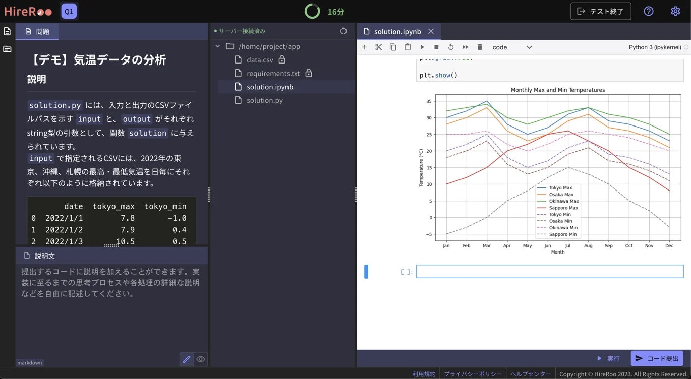 コーディング試験サービス『HireRoo(ハイヤールー)』(https://hireroo.io)を提供する株式会社ハイヤールー(本社:東京都渋谷区、代表取締役:葛岡宏祐)は、試験内でJupyter Notebookを実行できる機能をリリースしました。これにより、データサイエンティスト向けの問題が出せるようになります。