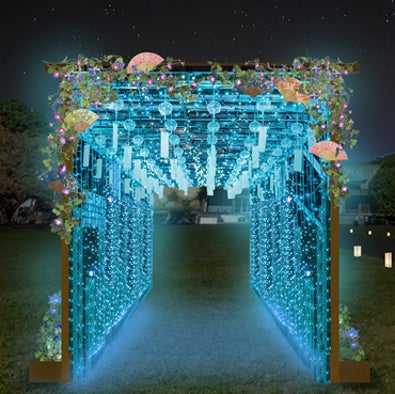 屏風を表現した立体花壇や瑞々しい花手水、睡蓮鉢がミストとともに涼を誘う幻想的な宿根草園。夏に咲き誇る彩り豊かな草花とともに、ここだけの特別な写真撮影をお楽しみください。夜は、立体花壇の足元に広がる花壇に、豊かな水を思わせるブルーのライトと点在するスポットライトのイルミネーションにより、普段見ることのできない花の表情をお楽しみいただけます。涼し気な朝顔のアーチには、まるで蛍が舞っているような幻想的な光の演出が施され、非日常空間を皆様にお届けします。
