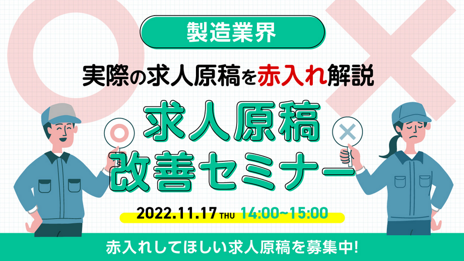 【社員採用担当者向け】人手不足に悩む製造業界の求人原稿改善セミナー!実際の求人原稿をリアルタイムに赤入れ解説