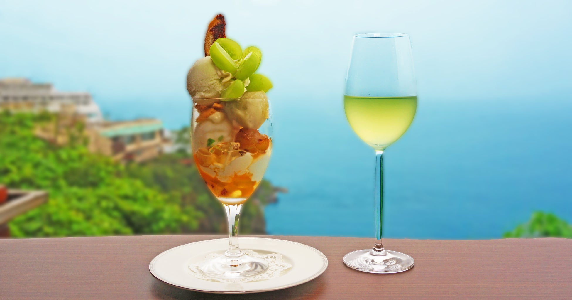 Restaurant & Sweets 花の妖精は、広大な相模灘を見下ろす断崖に建つ「伊豆随一の絶景」と謳われるカフェです。このたび提供するのは、瑞々しい果肉と上品な香りが特徴のシャインマスカット、濃厚なコクと甘味の強い巨峰をふんだんに使用し、白ワイン「ゲヴェルツトラミネール」をイメージした爽やかな味わいのパフェです。シャインマスカットと白ぶどうのさっぱりとしたソルベに、青紫蘇のアイスクリームを重ね、巨峰のマリネ、ヨーグルトのソルベで甘味とほのかな酸味を加え、マカダミアナッツのロースト、ホワイトセロリの食感をアクセントにしました。ミントのブラマンジェ、ハチミツレモンのジュレにアプリコットとライチのソースを絡め、トロピカルな風味に仕上げております。