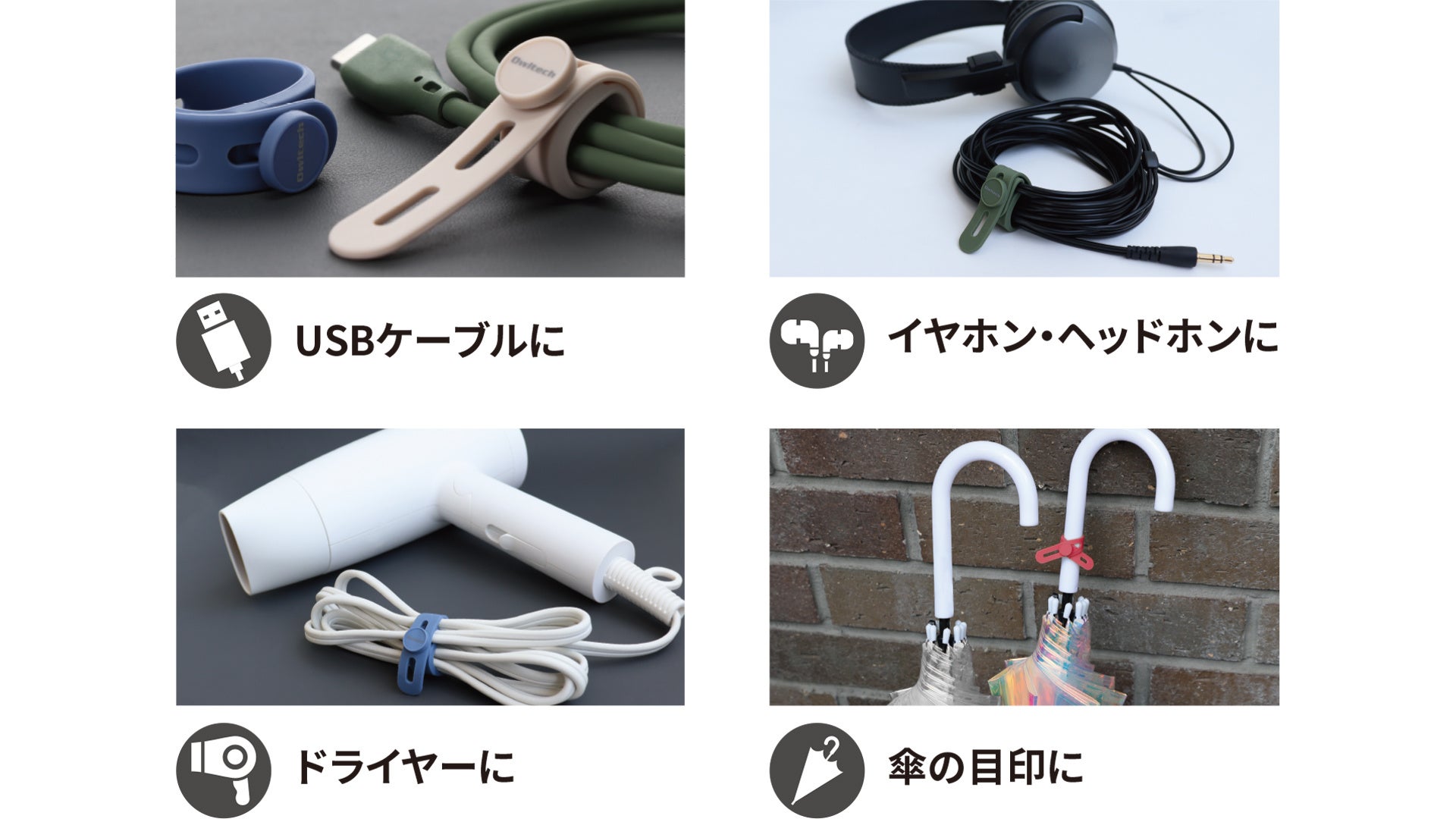 本製品は、USBケーブルを始めとしたイヤホンやマウス、キーボードなどの有線機器をスタイリッシュにまとめるシリコン製のケーブルバンドです。その他にも、パンやスナック菓子の食べかけた袋を閉じたり、ビニール傘につけて目印にしたり、アイデア次第でより多くの使い方ができます。